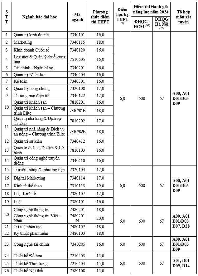 Đối với các chương trình đào tạo tại TPHCM (mã trường KSA) có điểm sàn chung là 20 điểm.