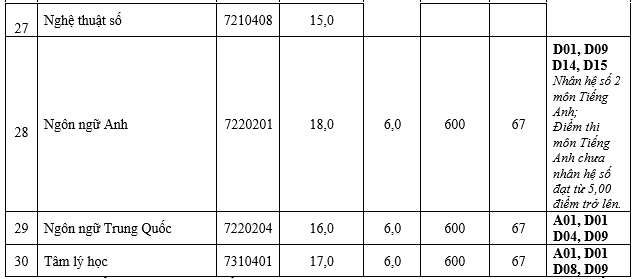 Xét tuyển vào ngành Ngôn ngữ Anh theo tổ hợp D01 (Toán, Văn, Anh) trong đó môn nhân hệ số 2 là môn Anh.