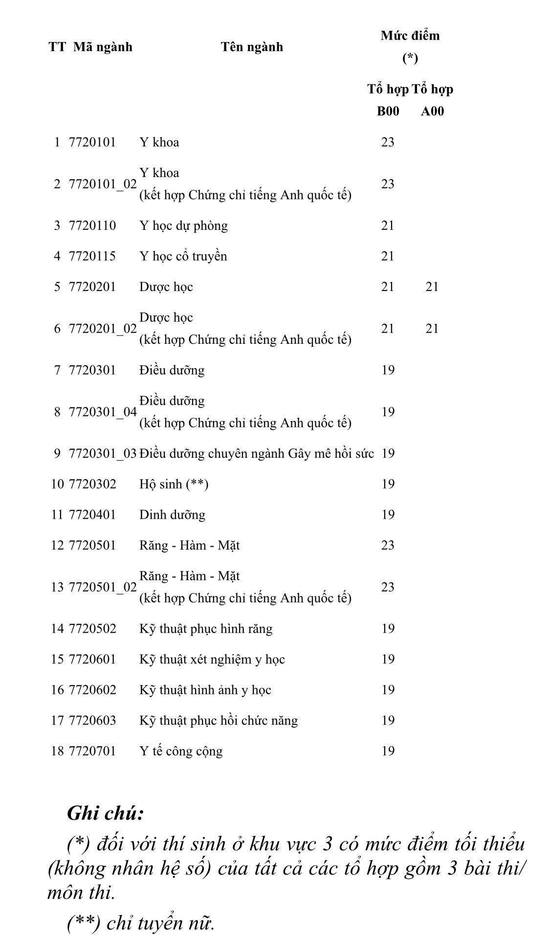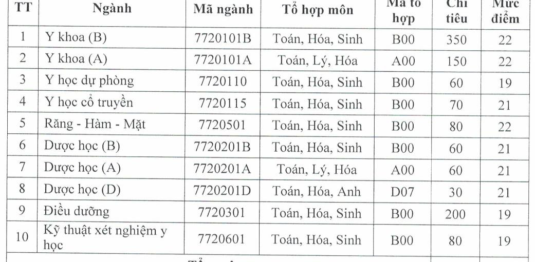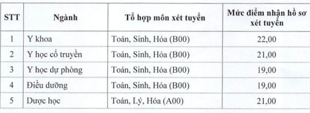 Năm 2020, Y khoa lấy điểm chuẩn cao nhất - 26,5, ngay sau là Răng Hàm Mặt 26,45. Hai tổ hợp của ngành Dược học lần lượt lấy 25,75 điểm (Toán, Hóa, Sinh), 25,35 (Toán, Lý, Hóa), Điều dưỡng thấp nhất 19,7.