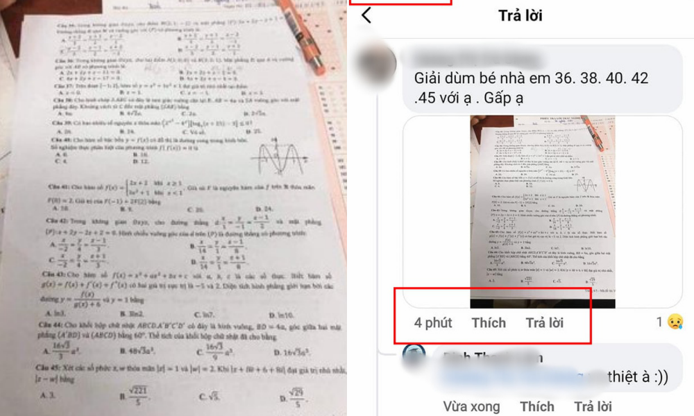 Cụ thể vào khoảng 15h50 (vẫn trong thời gian thí sinh làm bài thi), người này bình luận một hình ảnh được cho là đề thi môn Toán: "Giải giùm bé nhà em câu 36, 38, 40, 41 với ạ. Gấp ạ". Đáng nói là hình ảnh được chụp vẫn được đặt trên bàn phòng thi và còn nguyên số báo danh lẫn phiếu trả lời trắc nghiệm của thí sinh đó.
