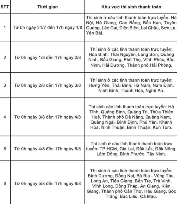 Bộ GD&ĐT chia thành 6 đợt để thí sinh các tỉnh thực hiện thanh toán trực tuyến lệ phí đăng ký nguyện vọng xét tuyển đại học năm 2024. Đây là quy định mới giúp đảm bảo an toàn, thuận lợi cho thí sinh trong quá trình thí sinh thực hiện thanh toán trực tuyến.