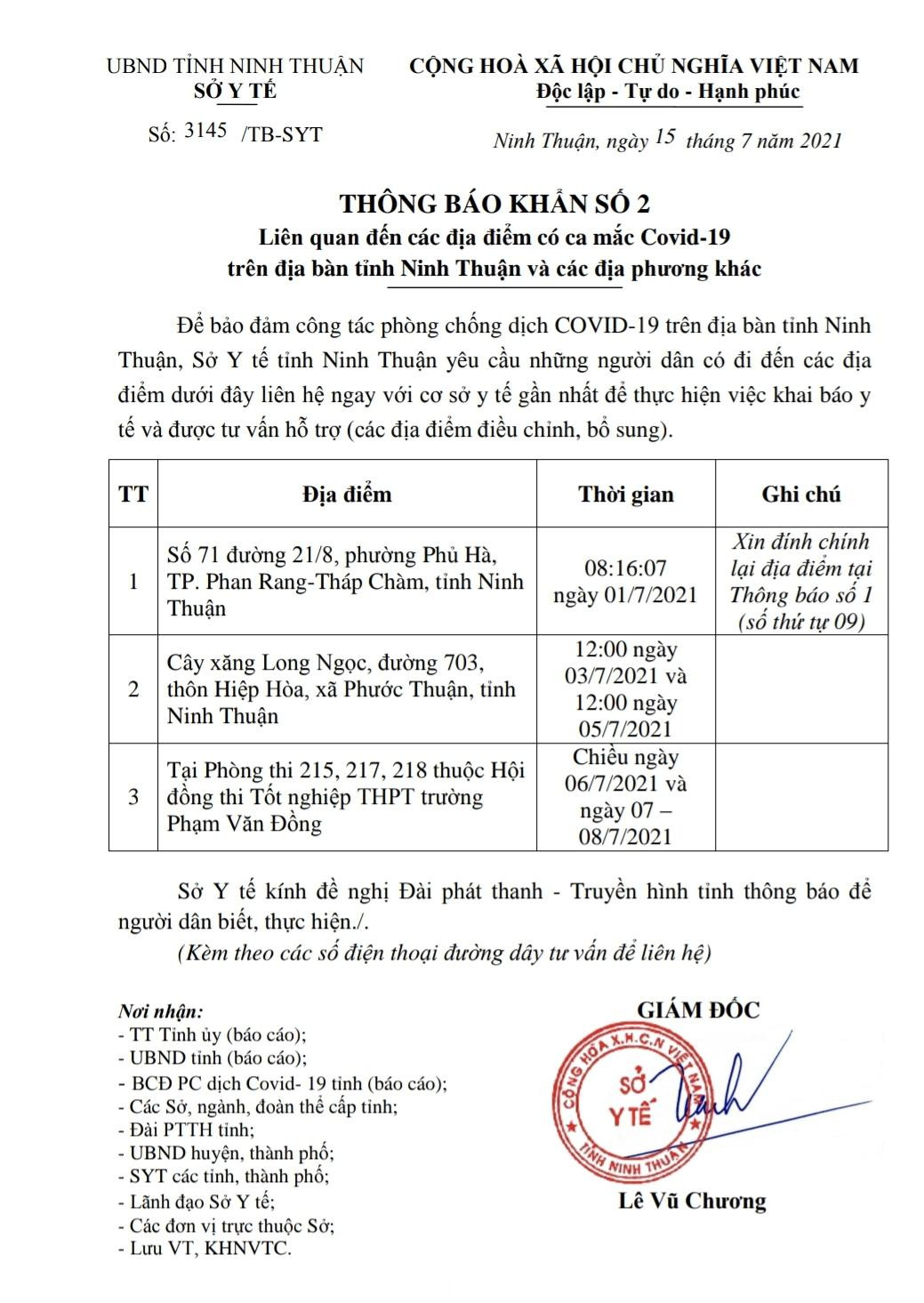 “Do có ca mắc COVID-19 dự thi, Sở Y tế Ninh Thuận đã ra thông báo yêu cầu những ai có liên quan và đi đến đến 03 phòng thi gồm 215, 217 và 218 thuộc Hội đồng thi tốt nghiệp THPT Trường Phạm Văn Đồng cần liên hệ ngay với cơ sở Y tế gần nhất để khai báo y tế và được tư vấn hỗ trợ”, ông Long nói.