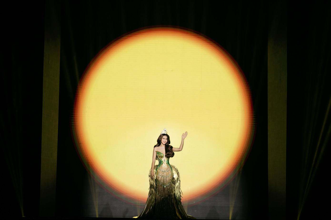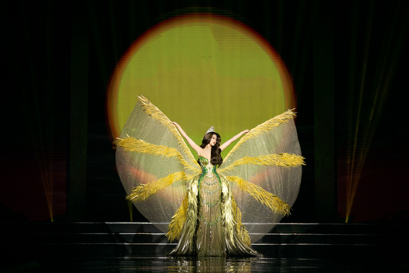 Sau màn ‘final walk’ của bốn Á hậu, Hoa hậu Đoàn Thiên Ân có màn xuất hiện ấn tượng. Diện trang phục của NTK Đỗ Long với tông màu chủ đạo là xanh emerald và vàng, bộ cánh gây dấu ấn với chi tiết xuyên thấu và phần đuôi ôm thân người. Điểm nhấn của thiết kế ở chiếc cánh lấy cảm hứng từ chiếc vương miện “The wings of beauty" mà cô đang mang. Trang phục mang lại hiệu ứng sân khấu đẹp mắt với màn tung tà trong màn trình diễn ‘final walk’.