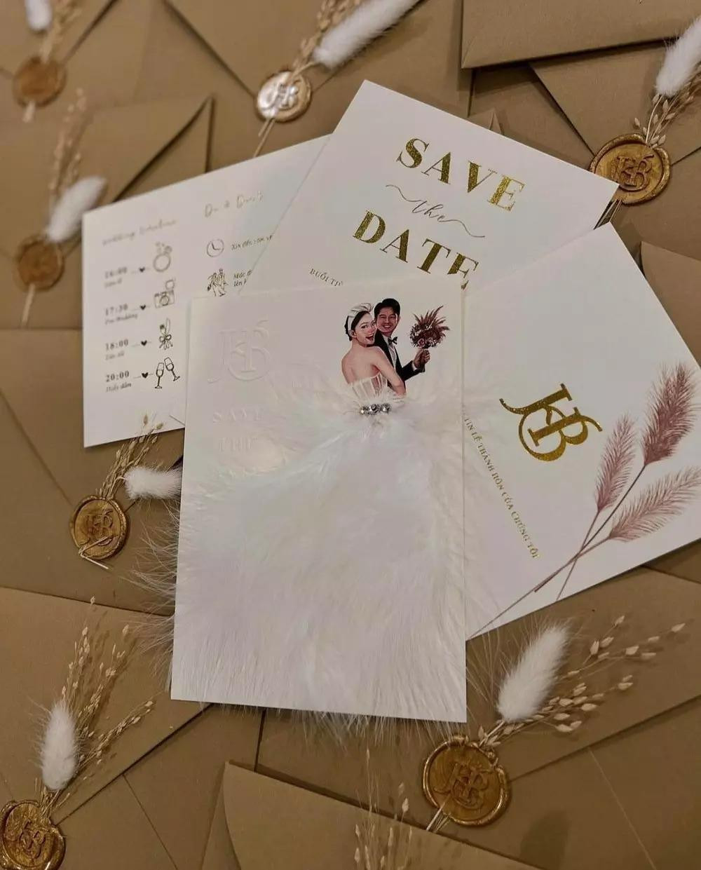 Trước đó, thiệp cưới của Minh Hằng và chồng đại gia gây ấn tượng bởi hình vẽ cô dâu - chú rể rất tinh tế và đặc biệt là chiếc váy cưới đính lông vũ đầy cầu kỳ.