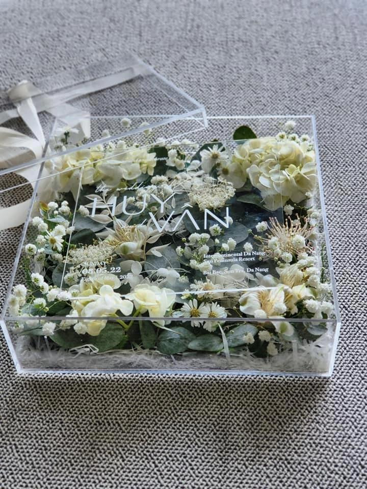 Nhưng đáng nói nhất là mỗi chiếc thiệp ấy lại được đặt trong một hộp mica phủ đầy hoa, nhìn trang trọng đẹp mắt như một món quà. Những loại hoa được chọn xếp trong hộp cũng do cô dâu Ngô Thanh Vân chọn lựa kỹ càng và hộp thiệp đặc biệt này khiến khách mời nào nhận được cũng muốn khoe ngay lập tức.