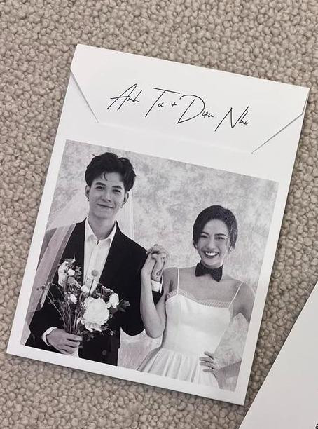 Thiệp cưới của Anh Tú và Diệu Nhi có thể không quá cầu kỳ nhưng lại rất khác lạ, từ bức ảnh cô dâu Diệu Nhi đeo nơ cổ của bộ suit chú rể còn Anh Tú lại đội khăn voan. Thêm vào đó, tâm thư trên thiệp cưới in ngược toàn bộ và khách mời phải soi vào gương mới đọc được.