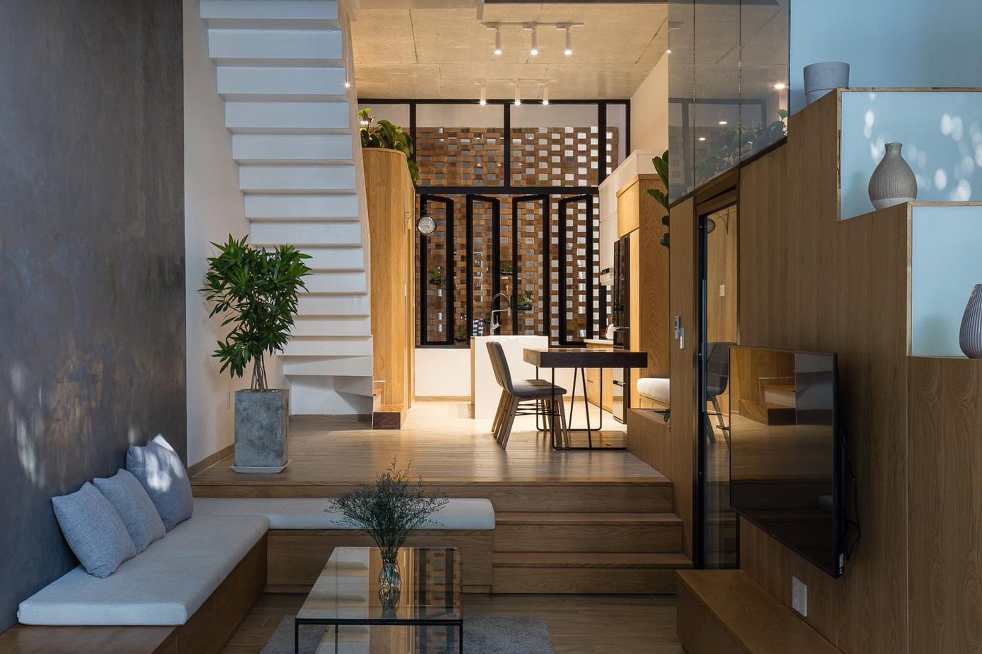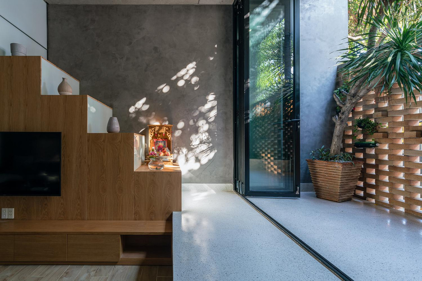 | Dưới giếng trời là khoảng thông tầng lớn giữa nhà không chỉ giúp không gian bên trong sáng sủa, thoáng mát (nắng được điều hòa nhờ hệ lam xoay và gió qua các khe gạch) mà còn tăng tính tương tác, kết nối giữa các thành viên trong gia đình. |