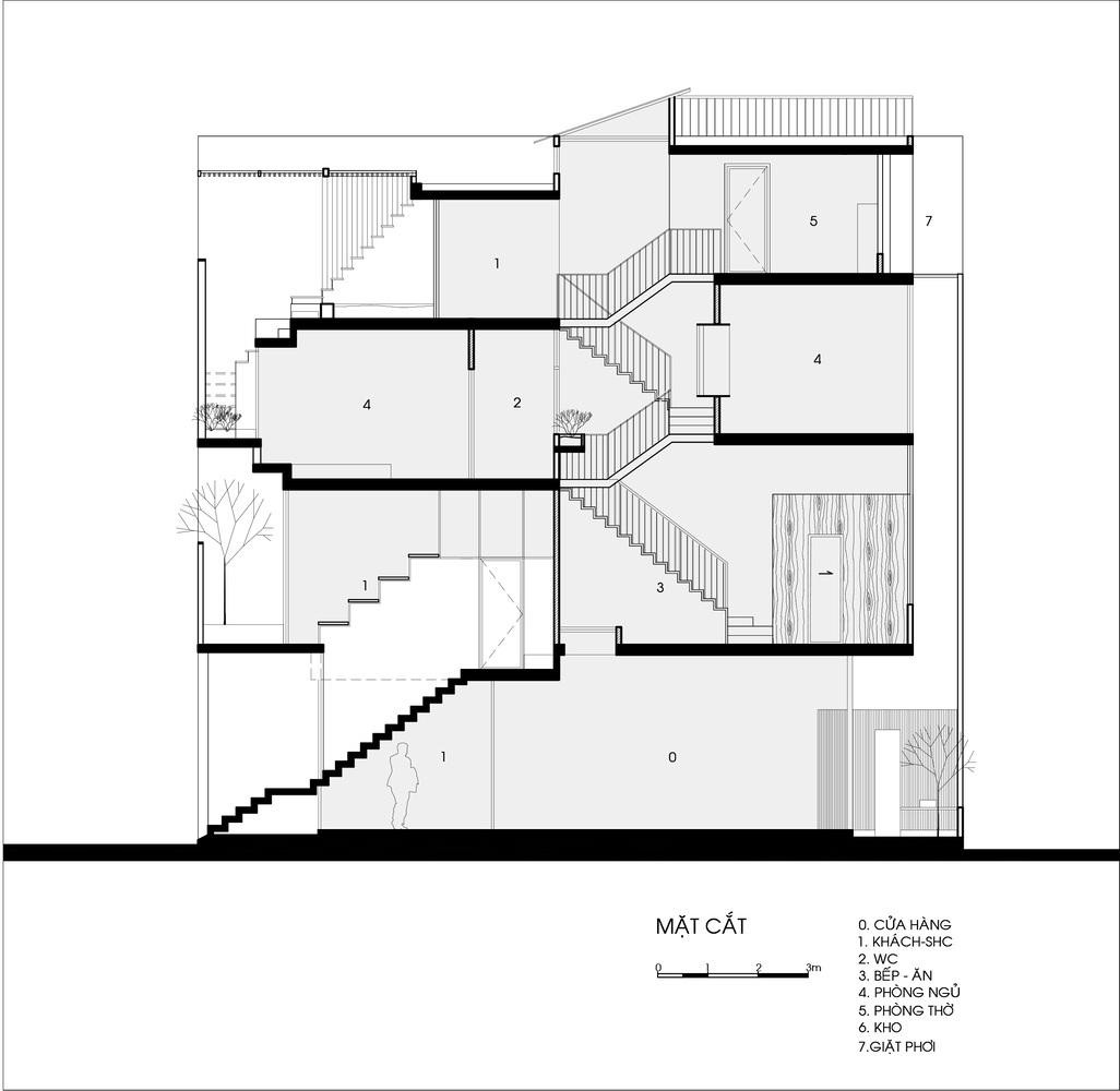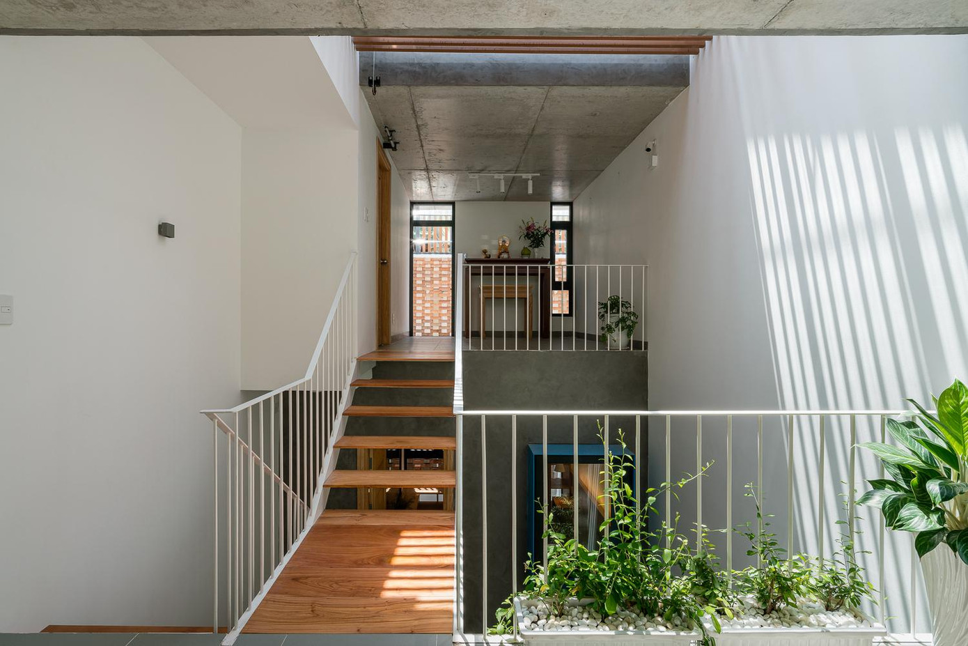 | Cầu thang giữa và trước nhà vừa tạo sự linh hoạt cho giao thông (trong phòng ngủ có thể đi thẳng ra vườn trên sân thượng mà không cần phải đi từ cầu thang giữa nhà) vừa tạo tầm nhìn ra các không gian thoáng đãng, tạo sự trải nghiệm hàng ngày và khám phá cho người dùng. |
