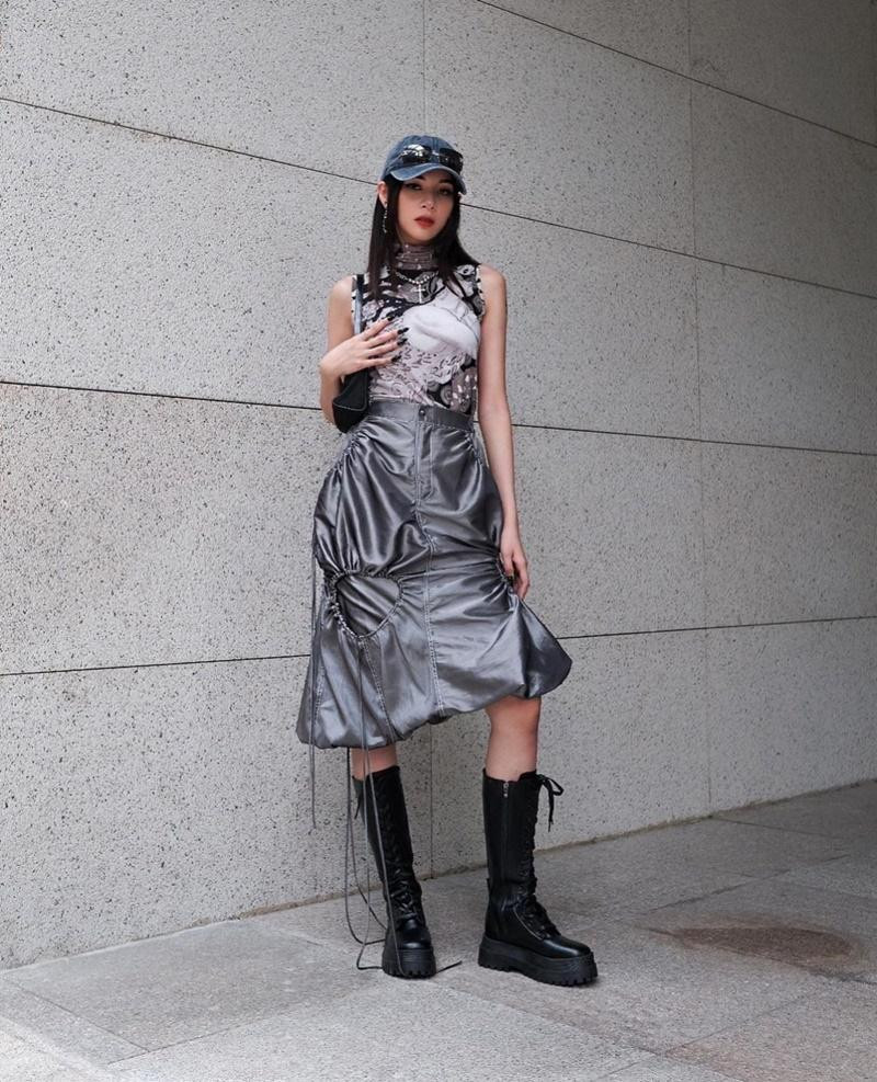 Phí Phương Anh xuống phố với set đồ hầm hố gồm áo tanktop cổ lọ và chân váy thiết kế lạ mắt.