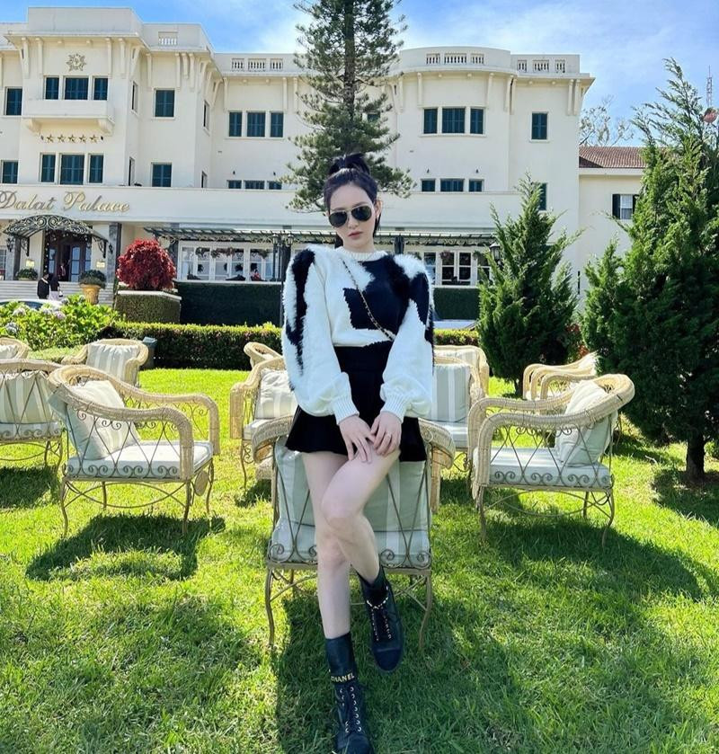 Hiền Hồ được khen hết lời khi mặc áo len lông gam màu trắng - đen nổi bật, mix cùng chân váy chữ A và bốt da hàng hiệu.