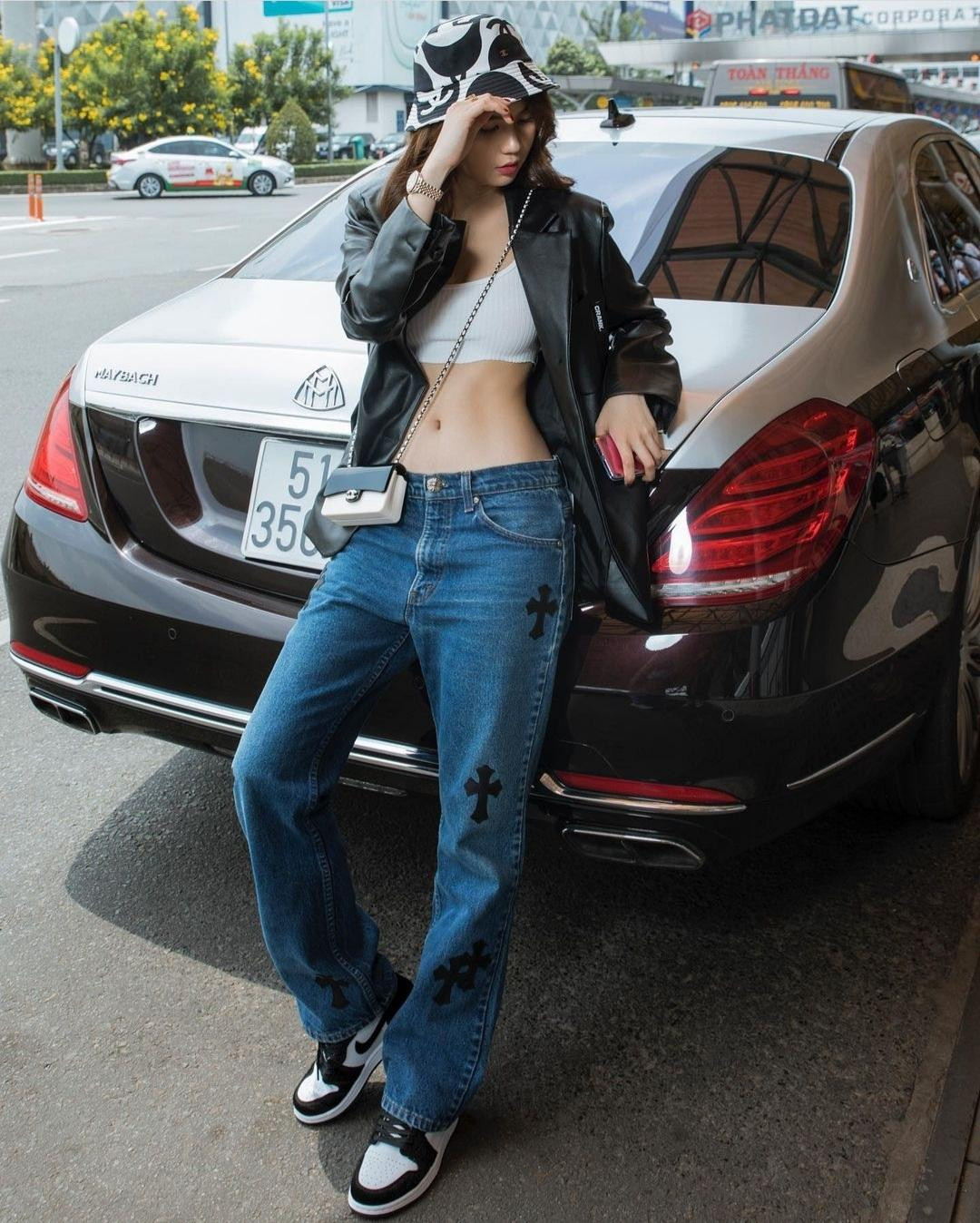 Ngọc Trinh khoe vòng eo con kiến huyền thoại với áo crop-top trắng, mix cùng quần jeans ống rộng và áo khoác da đen thời trang.