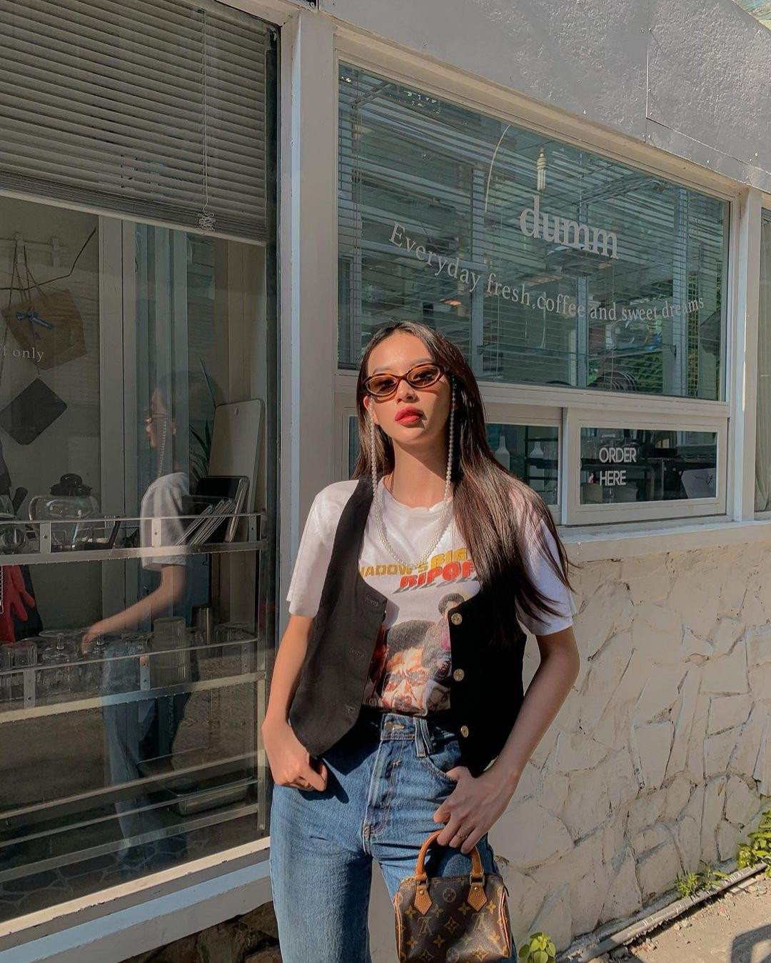 Mặc áo phông bên trong mix cùng áo ghi lê đen bên ngoài, kết hợp quần jeans ống rộng, Phí Phương Anh chuẩn phong cách fashionista chuyên nghiệp.