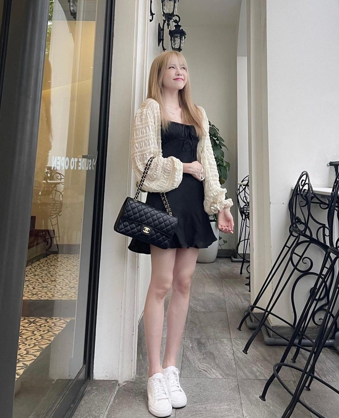 Thiều Bảo Trâm trẻ trung như nữ sinh với váy liền ngắn màu đen, phối cùng áo khoác cardigan tay bồng phong cách Hàn Quốc.