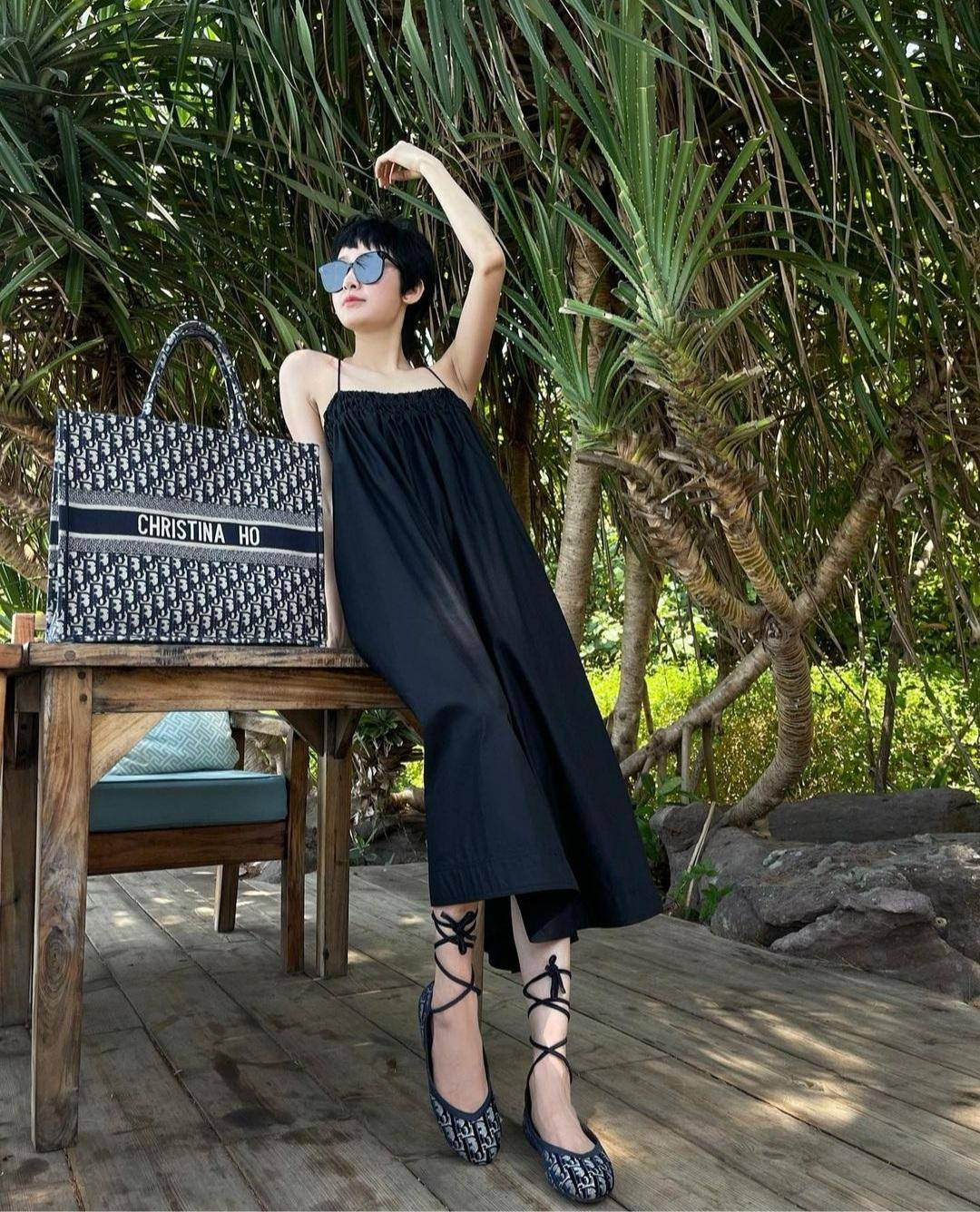 Hiền Hồ thả dáng dịu dàng với váy hai dây form rộng mát mẻ, mix cùng giày búp bê buộc dây tone sur tone.