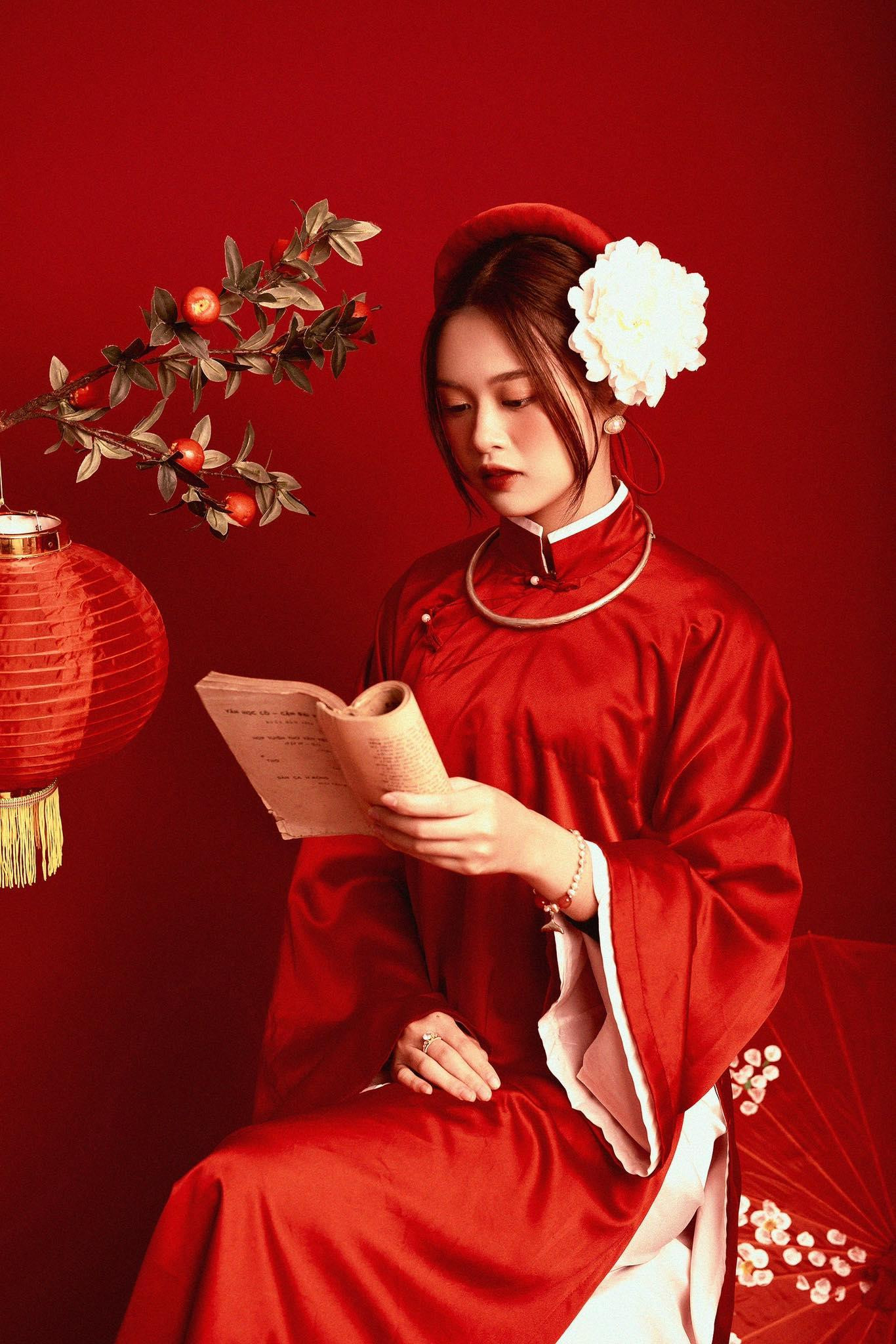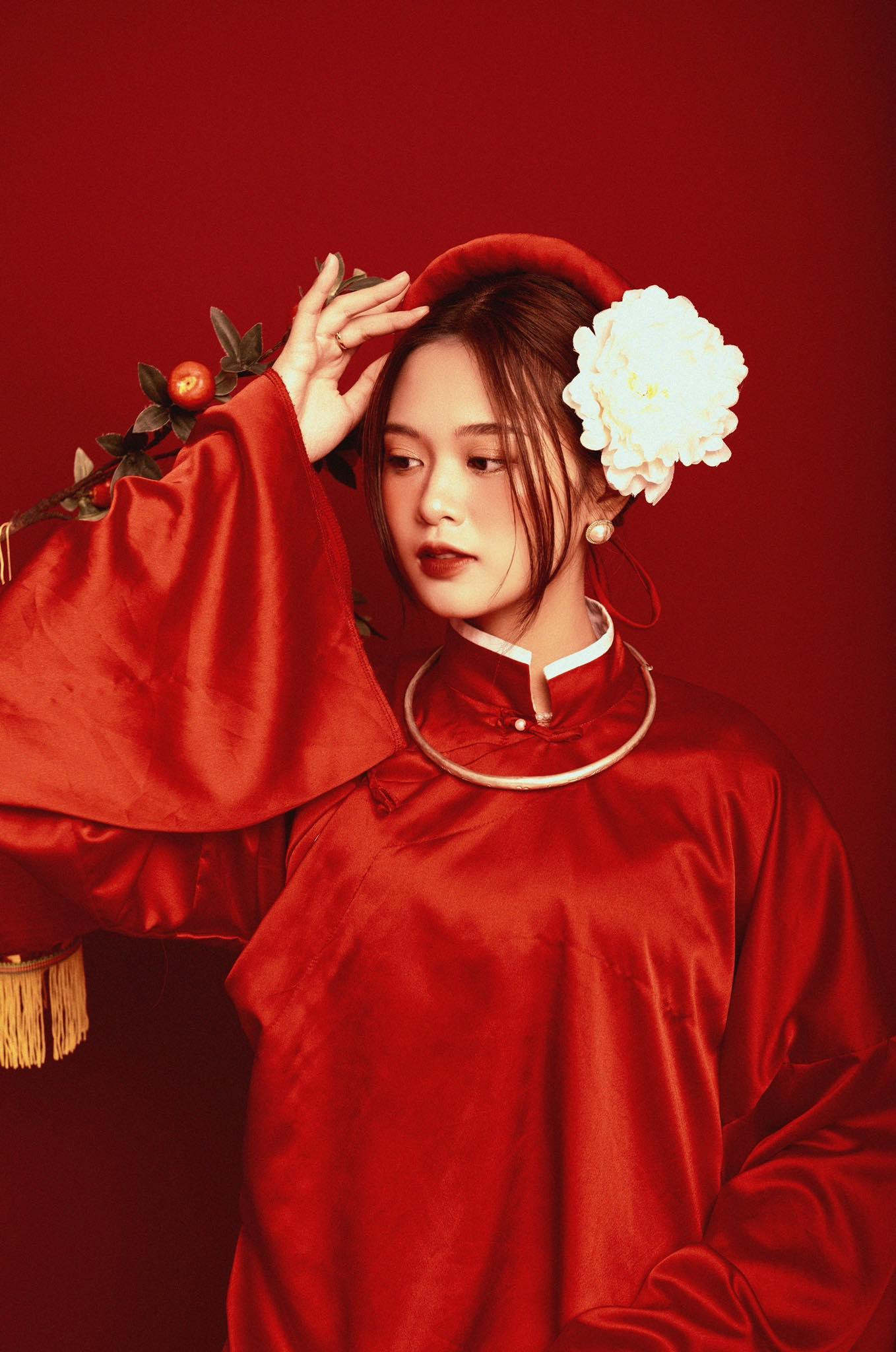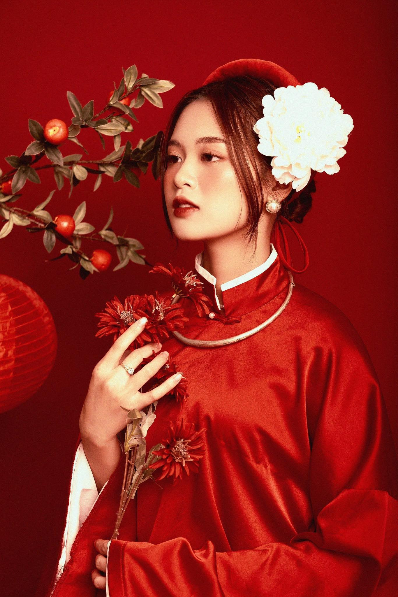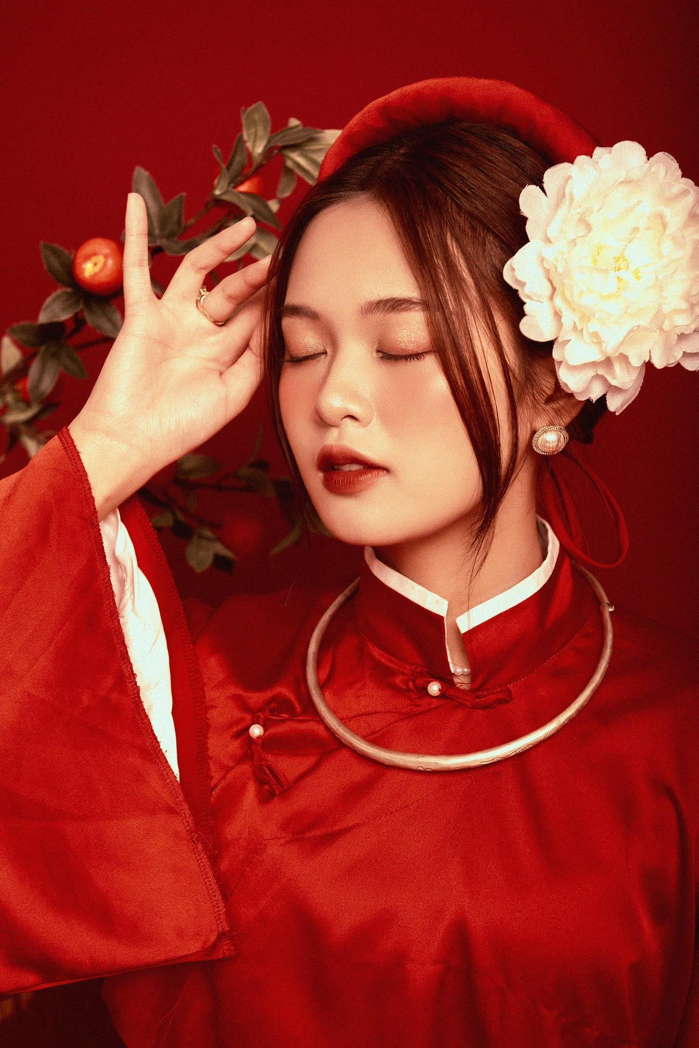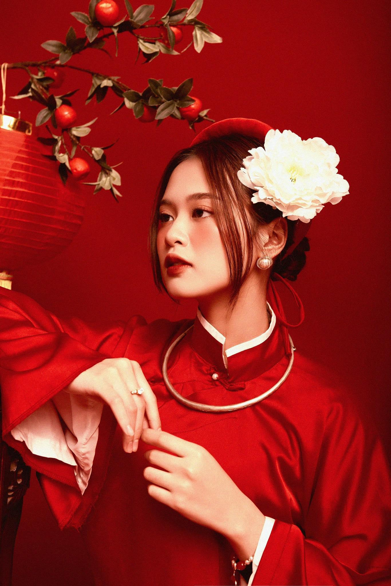 | Lựa chọn áo dài đỏ, Khánh Linh hy vọng về một năm mới nhiều may mắn, hạnh phúc. |