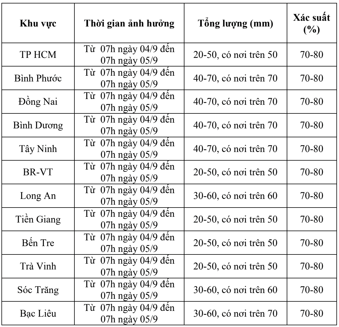 Dự báo từ ngày 4/9 đến ngày khai giảng năm học mới (5/9), khu vực Nam Bộ có mưa rào nhiều nơi, rải rác mưa vừa và dông, có nơi mưa to đến rất to, mưa tập trung vào thời gian chiều và tối.