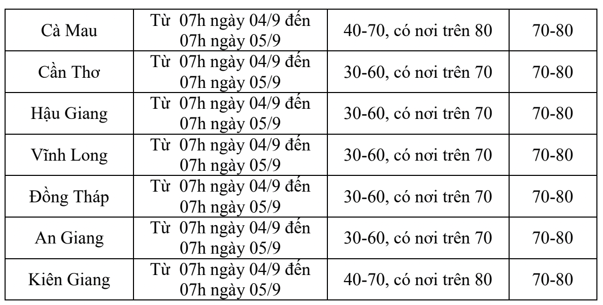 Do ảnh hưởng của gió mùa Tây Nam hoạt động mạnh nên trong ngày và đêm nay 4/9, vùng biển từ Bà Rịa - Vũng Tàu đến Cà Mau; Cà Mau đến Kiên Giang (bao gồm Phú Quốc), vịnh Thái Lan và khu vực Nam Biển Đông (bao gồm cả vùng biển quần đảo Trường Sa) có mưa rào và dông. Trong mưa dông có khả năng xảy ra lốc xoáy và gió giật mạnh.