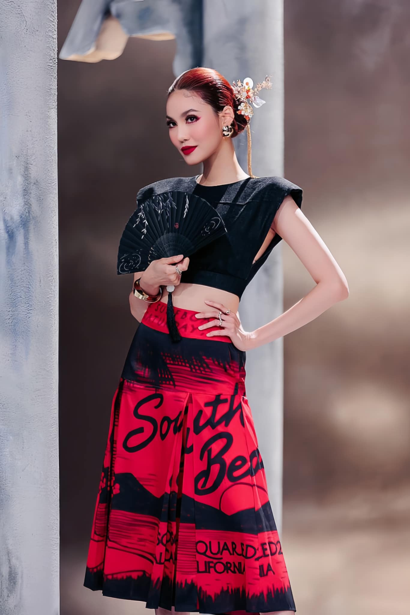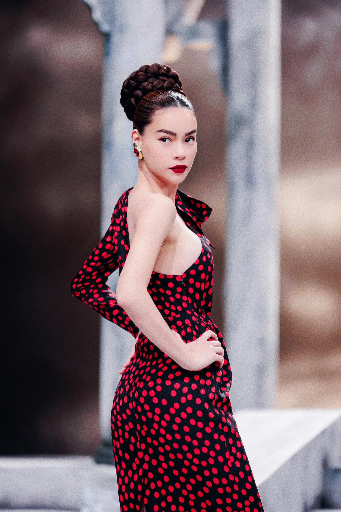 Ở phần sau, người đẹp chọn chiếc váy body cổ yếm màu đỏ đính đá, kết hợp cùng layout make-up và mái tóc được tạo hình lạ mắt.