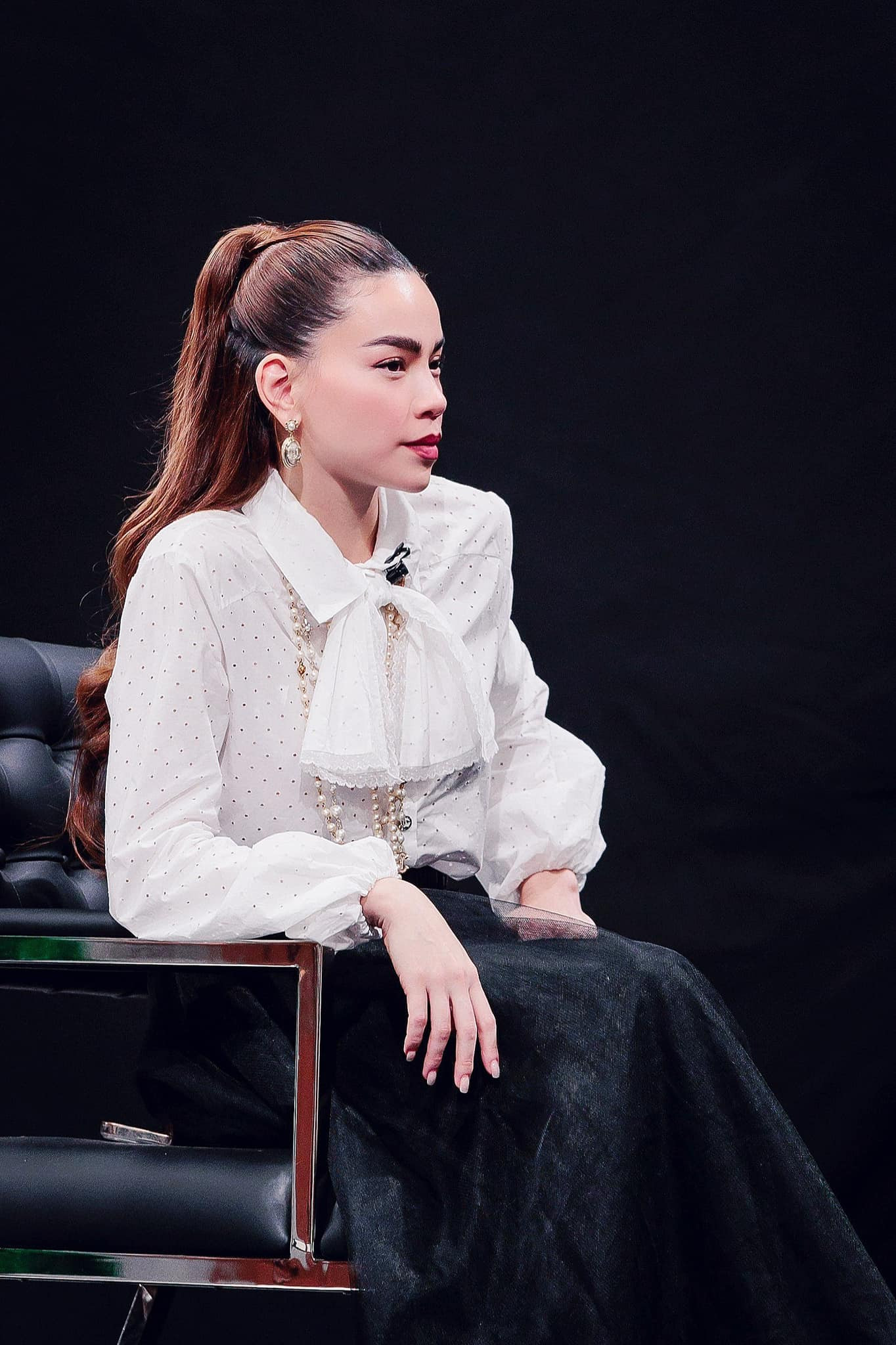 Ở phần thử thách cùng thí sinh, Hồ Ngọc Hà chọn phong cách đơn giản để dễ dàng di chuyển khi kết hợp áo sơ mi với chân váy đen, mix cùng trang sức đến từ Chanel.