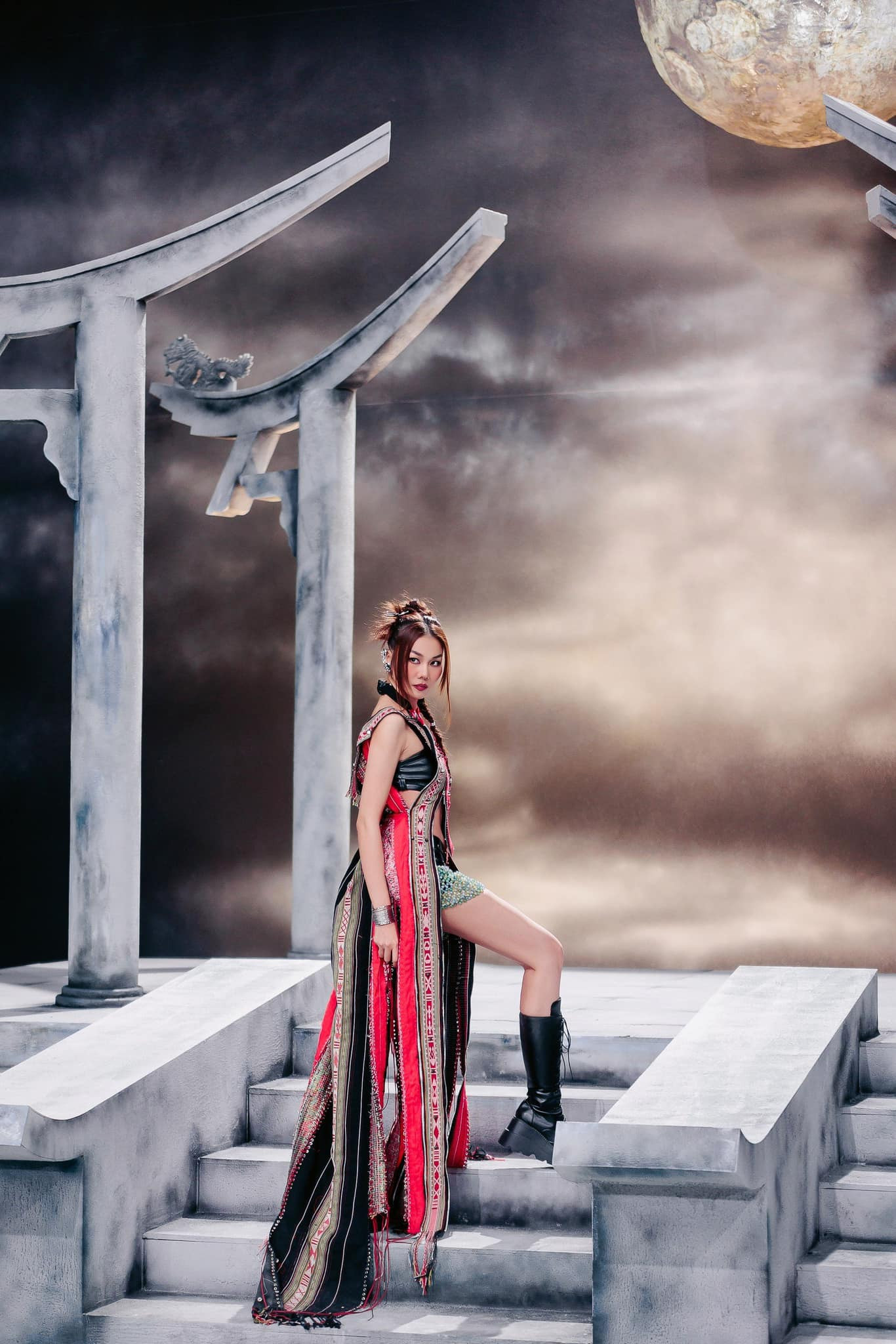 Ở đầu tập 2, Thanh Hằng xuất hiện với váy thổ cẩm, kết hợp cùng giày bốt cao cổ và tóc búi đuôi công.