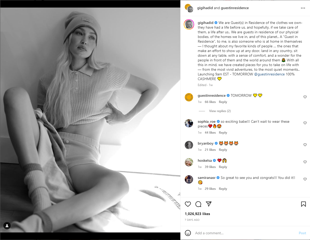 Mới đây, nàng “IT girl” Gigi Hadid cũng gửi gắm tinh thần ủng hộ thời trang bền vững với màn ra mắt thương hiệu thời trang dệt kim riêng Guest in Residence.