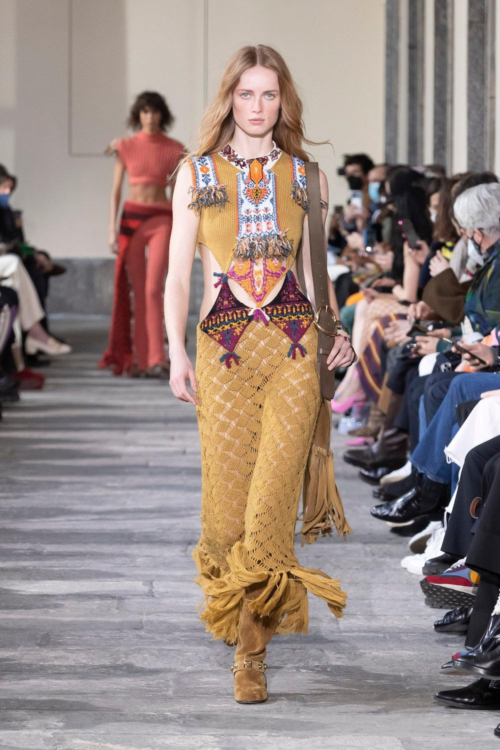 Đồ len đan móc cũng dần được các thương hiệu thời trang lớn quan tâm. BST Thu Đông 2022 cũng ghi nhận những thiết kế đồ len đan móc lạ mắt trên sàn runway.