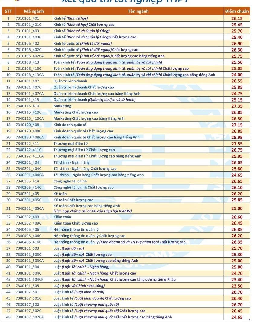 Theo thống kê của trường, điểm trung bình trúng tuyển năm 2022 là 26,36. Trong đó, điểm trung bình khối ngành Kinh tế là 26,22 điểm, khối ngành Kinh doanh là 26,64 điểm và khối ngành Luật là 25,65 điểm. Đây là tổng điểm của 3 môn trong tổ hợp xét tuyển A00, A01, D01 và D07 đối với học sinh THPT khu vực 3 và không nhân hệ số.