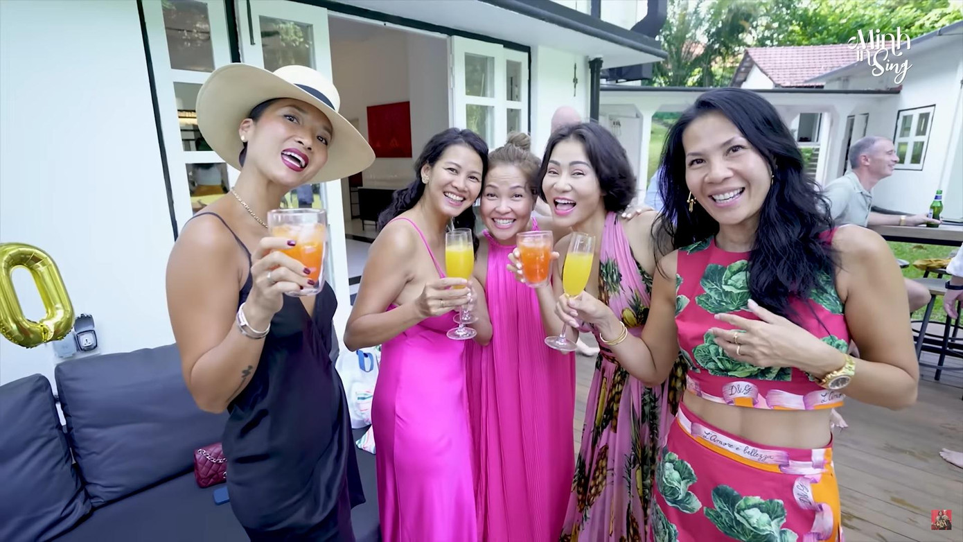 Ngoài ra, hội bạn thân của Thu Minh cũng đã xuất hiện tại buổi tiệc. Nữ ca sĩ ngạc nhiên khi siêu mẫu Bằng Lăng lộ diện trong bộ đồ gợi cảm và tuyên bố “chặt chém” Thu Minh khiến mọi người không nhịn được cười.