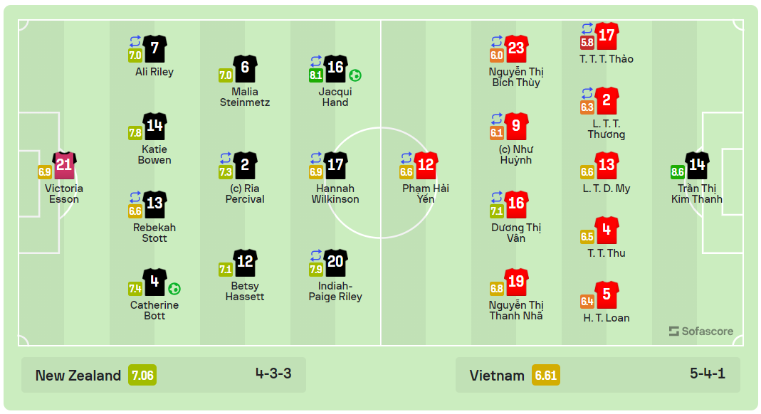 Trong suốt trận đấu, thủ môn Kim Thanh là chốt chặn đáng tin cậy của tuyển nữ Việt Nam. Đội bóng của HLV Mai Đức Chung có thể đã vỡ trận nếu số 14 không bắt tốt ở trận này. Các con số thống kê không nói dối. Theo Sofascore, Kim Thanh có tổng cộng 10 pha cứu thua trước New Zealand và được chấm điểm cao nhất trận (8,6 điểm). Đáng chú ý, thủ môn tuyển nữ Việt Nam có đến 6 tình huống cản phá trong vòng cấm. Ngoài ra, cô còn có 2 pha đấm bóng thành công và chuyền bóng chính xác đến 32 lần (đạt tỷ lệ 86%).