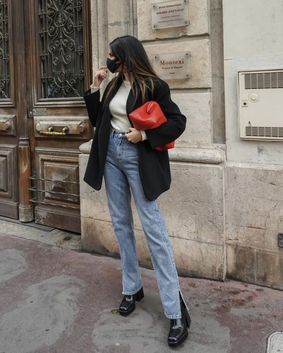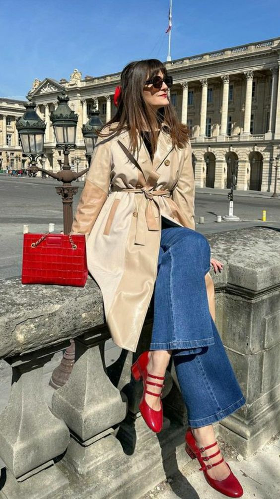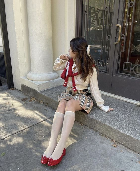 Sắc đỏ được dùng để "nâng tầm" tạo hình thông qua các phụ kiện kẹp nơ, hoặc giày Mary Jane đỏ, kết hợp cùng các món đồ kinh điển như váy dạ tweed, quần jeans, áo khoác dáng dài...