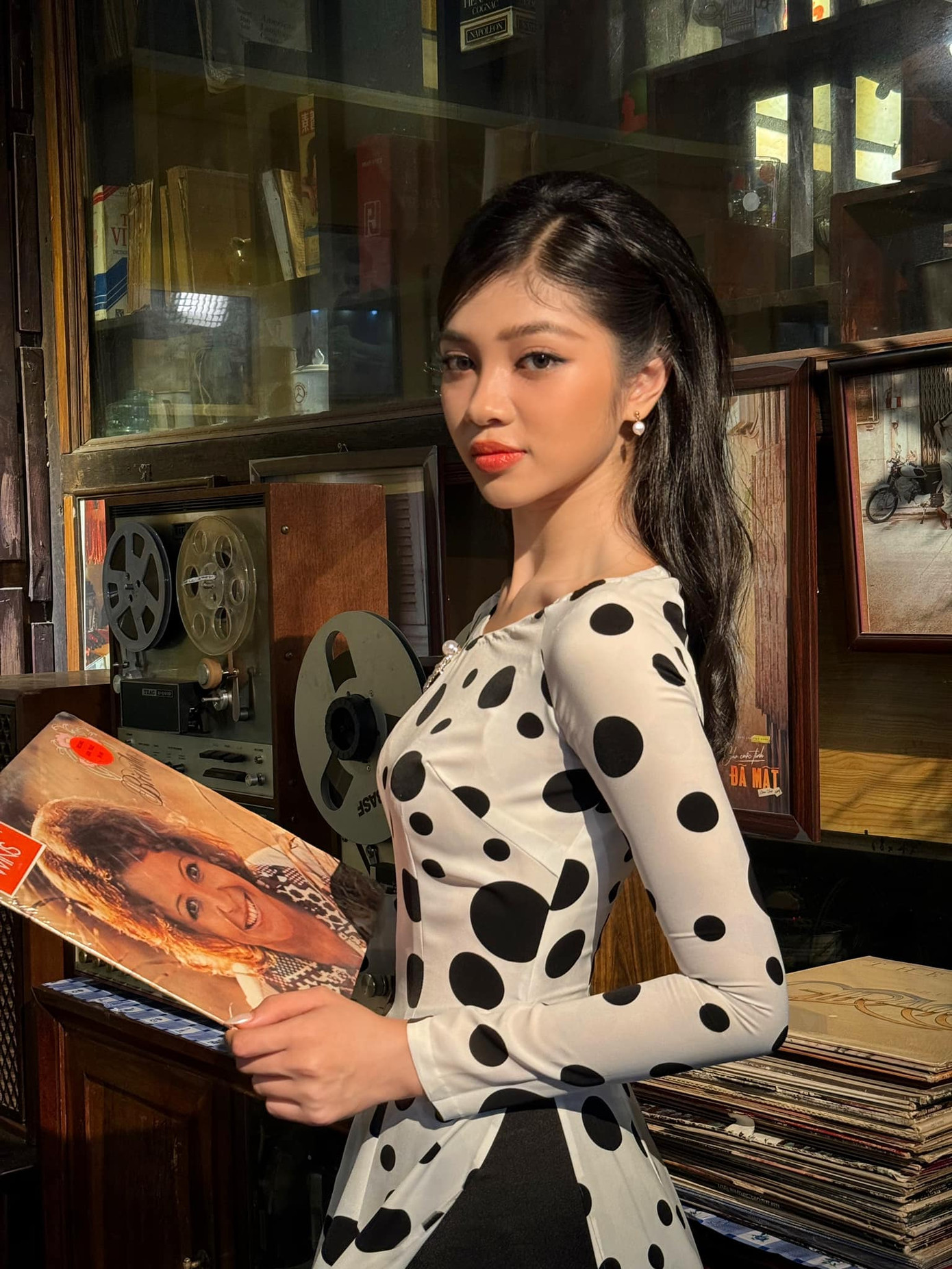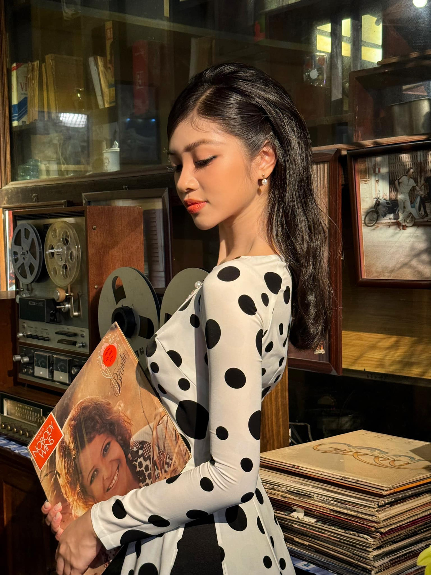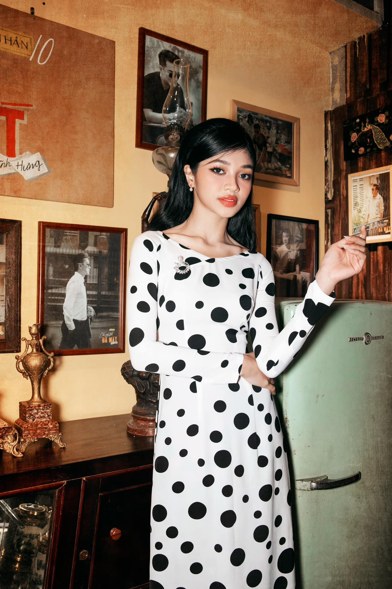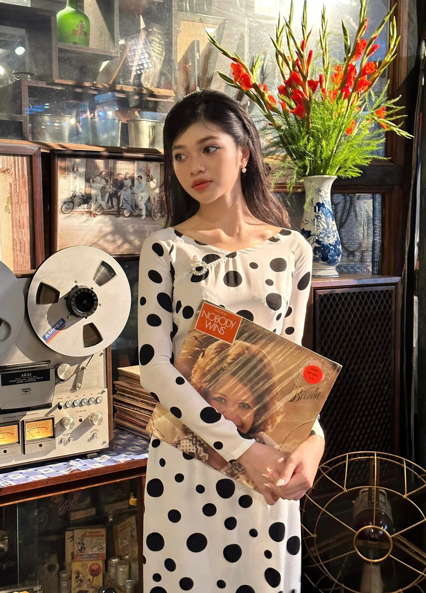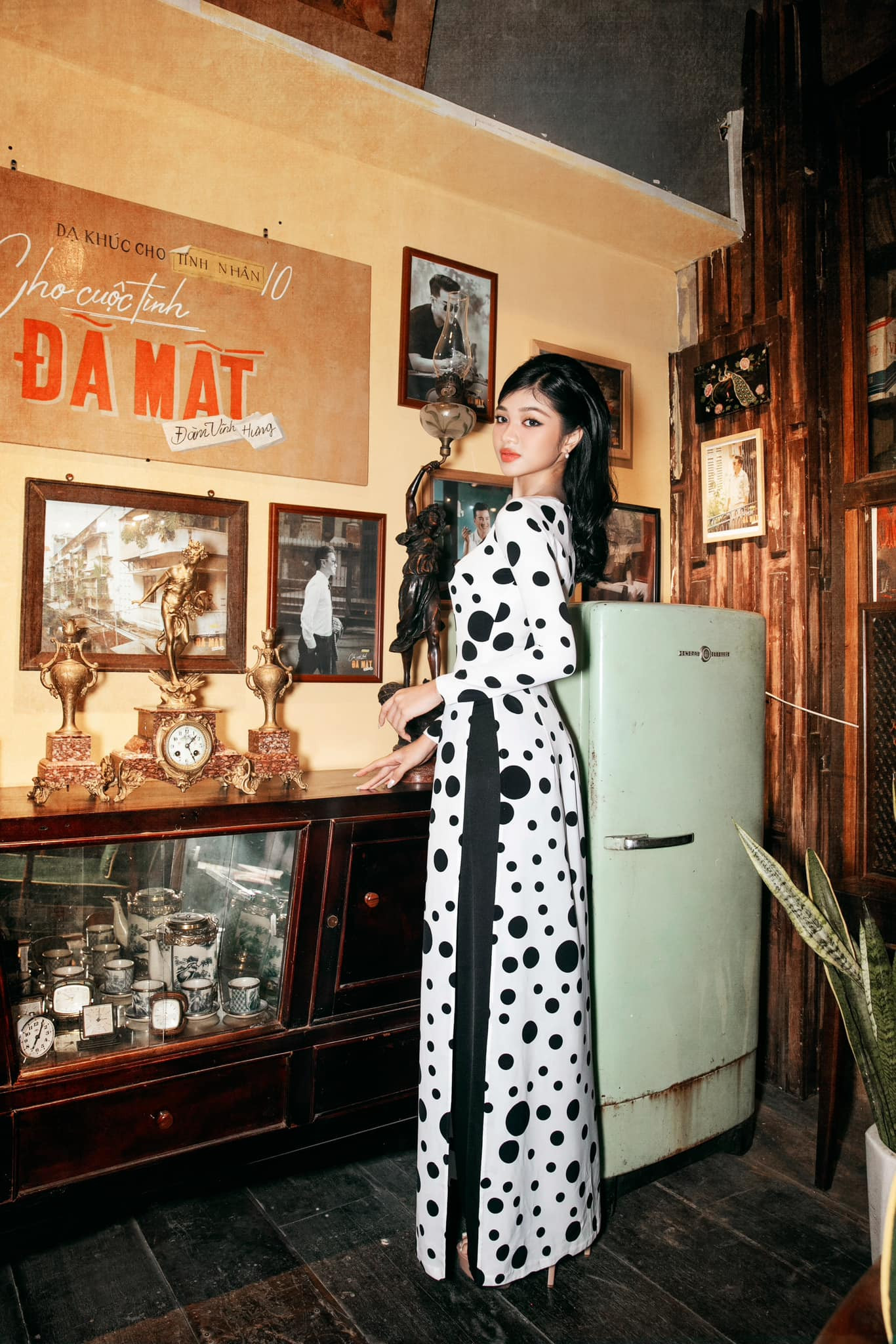 Nàng hậu mặc áo dài cổ thuyền có họa tiết chấm bi kèm quần lụa đen, đánh tóc phồng và trang điểm nhấn mạnh vào đôi mắt giống như các người đẹp những năm 1960, 1970.