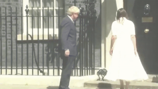 Thước phim ghi lại khoảnh khắc này đang gây sốt trên mạng, khi mọi người chú ý đến cách ông Johnson dùng quá nhiều sức để giật tay nữ Thủ tướng mảnh khảnh.