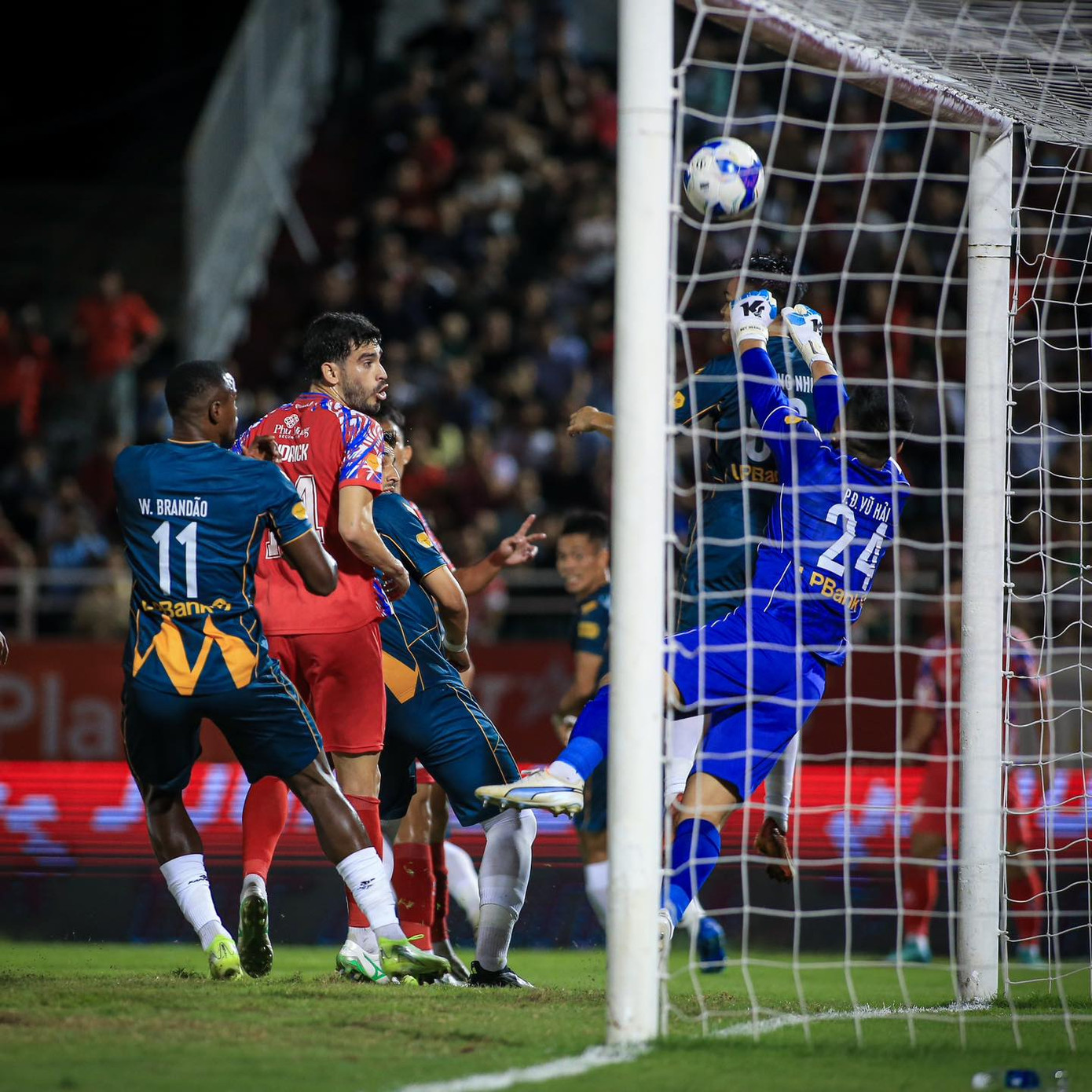 Phút 14: Hàng thủ TP.HCM bị đe dọa vì pha bóng lộn xộn trong vùng cấm. Brandao không thể đánh đầu, sau đó dứt điểm bóng 2 nhưng bất thành.