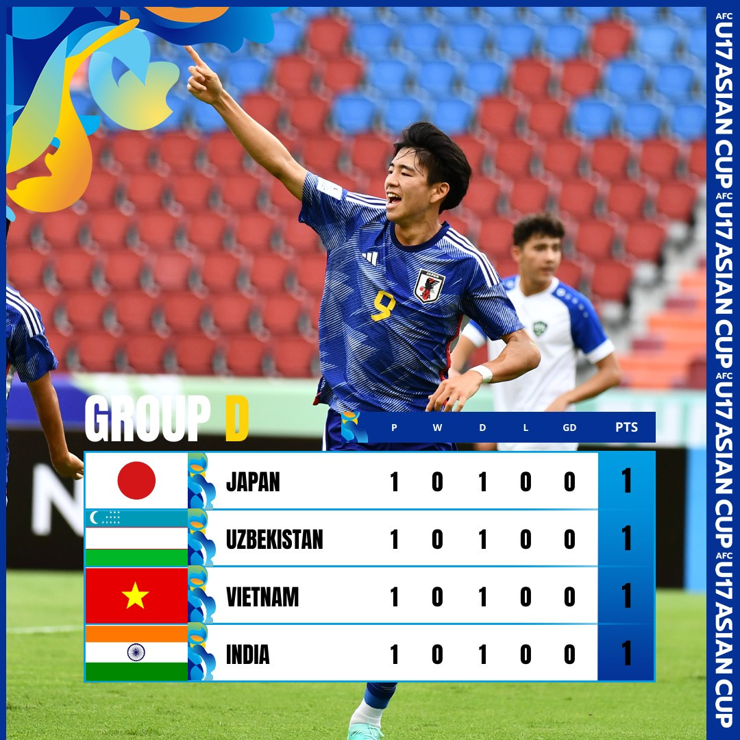 Cục diện bảng D VCK U17 châu Á 2023 cực kỳ phức tạp khi 4 đội bóng Việt Nam, Nhật Bản, Ấn Độ và Uzbekistan đều có 1 điểm sau lượt trận đầu tiên. Tình thế của U17 Việt Nam khó khăn hơn, bởi lẽ thầy trò HLV Hoàng Anh Tuấn bị đối thủ yếu nhất bảng cầm hòa 1-1.
