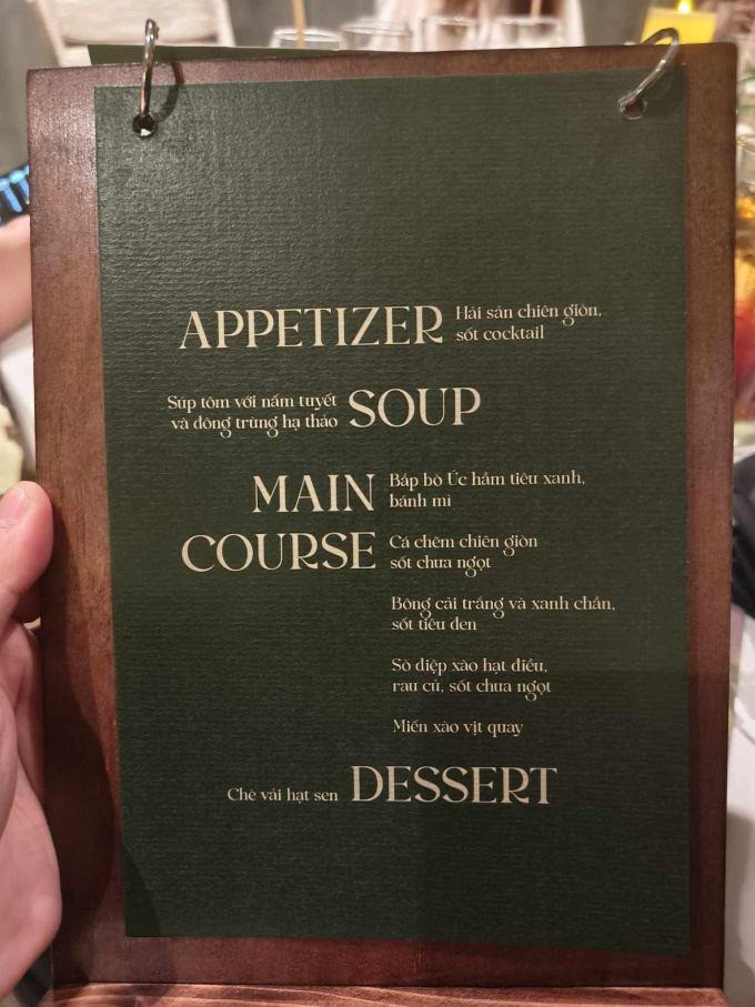 Tiệc cưới của “cơ trưởng đẹp trai nhất Việt Nam” Quang Đạt cùng beauty blogger Hà Trúc thì chọn set menu gồm 6 món. Thực đơn mà Quang Đạt, Hà Trúc lựa chọn có tới 4 món chính, nhiều nguyên liệu đắt đỏ như nấm truffle, hàu Nhật, sò điệp…