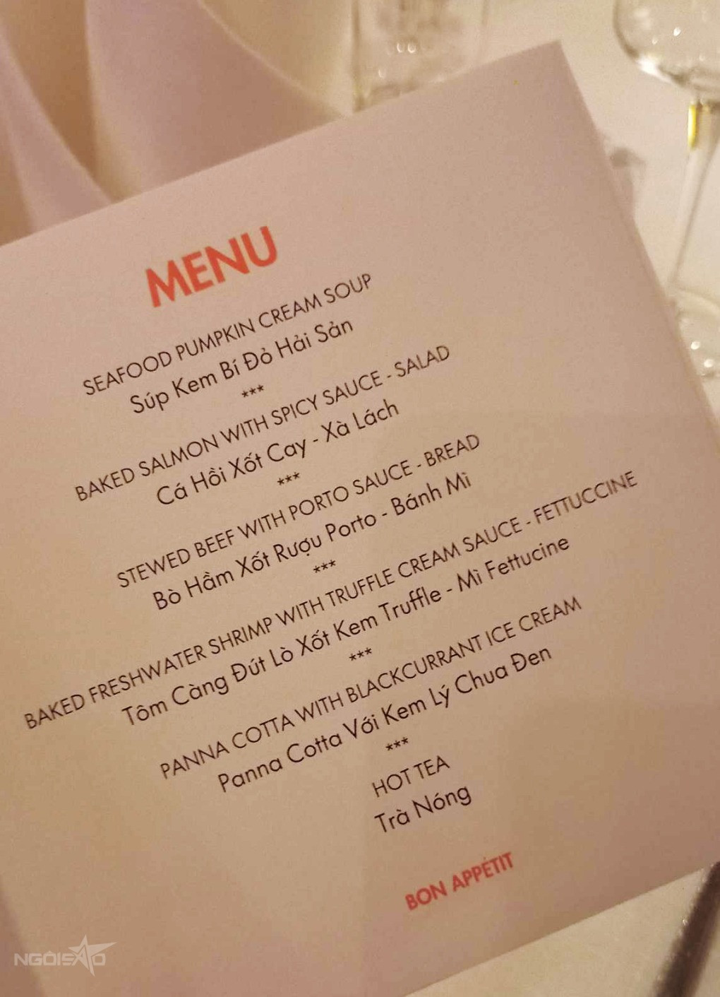 Hoặc tiệc thành đôi của Vũ Cát Tường và Bí Đỏ cũng gây trầm trồ với thực đơn 8 món kết hợp các món Á và Âu rất khéo léo. Bên cạnh những món ăn đã từng xuất hiện ở nhiều tiệc cưới khác thì khán giả đặc biệt chú ý đến món khai vị súp tôm với nấm tuyết và đông trùng hạ thảo vì hai nguyên liệu này vô cùng đắt đỏ.