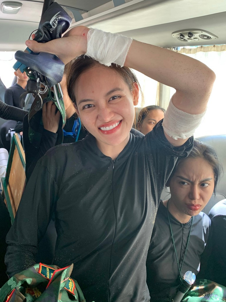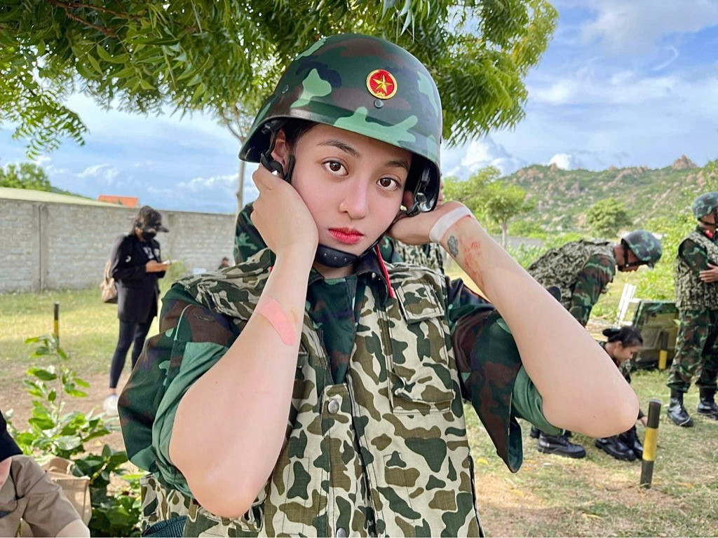 Nữ diễn viên cũng hé lộ loạt ảnh hậu trường ghi lại 7 ngày trong quân ngũ. Cô nàng gây cười với đôi môi bôi đen và gương mặt vẽ đầy vết chân chim để cải trang khi làm cô du kích. Thùy Anh còn khoe các vết bầm tím trên tay. Dù trải qua nhiều thử thách, nữ diễn viên vẫn giữ sự hào hứng và tinh thần tích cực.