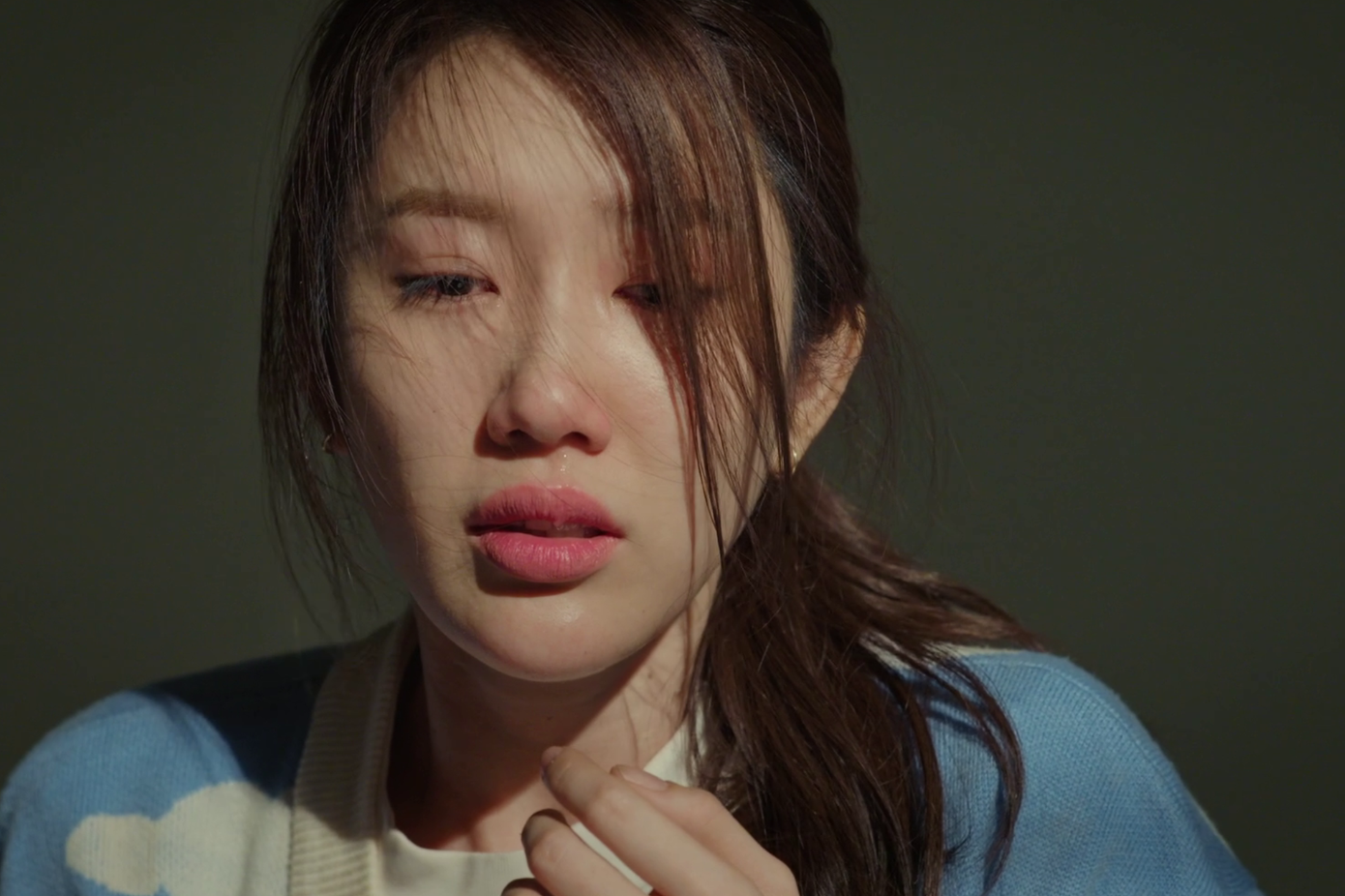 Nữ diễn viên kể: "Cảm thấy bất lực với bản thân vì không thể khóc, tôi phải dùng đến biện pháp chế dầu xanh vào mắt để kích thích nước mắt. Tuy nhiên, phương pháp này gây ra phản ứng khiến mắt tôi cay đến mức phải chớp liên tục, làm gián đoạn quá trình quay”.