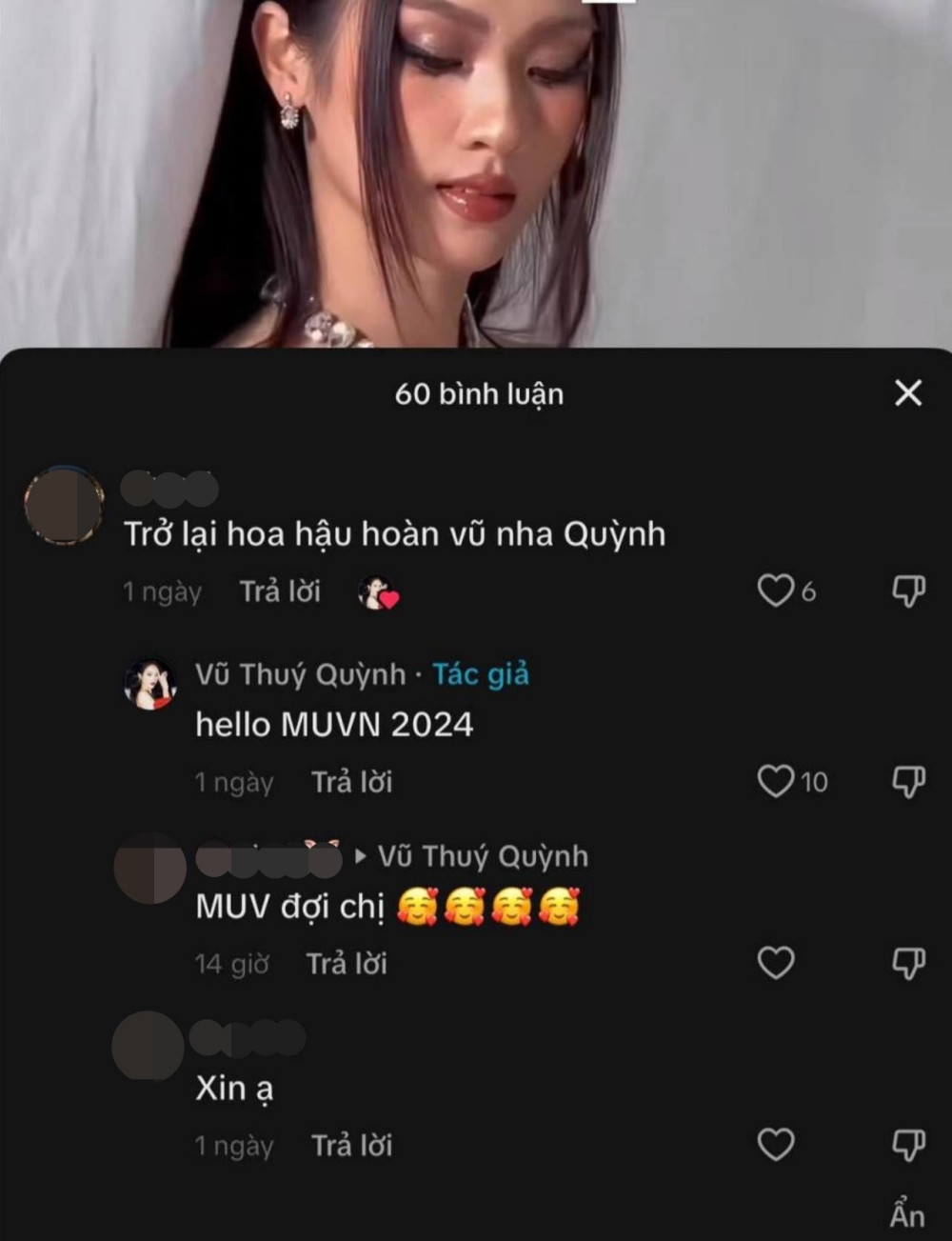 Trên trang cá nhân, người đẹp Vũ Thúy Quỳnh úp mở về khả năng tham gia Miss Universe Vietnam 2024 và nhận được sự ủng hộ của người hâm mộ. Người đẹp sinh năm 1998, đến từ Điện Biên, cao 1m74, số đo hình thể 84-63-94 cm. Thúy Quỳnh nổi bật với loạt thành tích thi sắc đẹp: Người đẹp Ảnh - Top 10 Hoa hậu Hoàn Vũ Việt Nam 2022, Top 12 Siêu mẫu Việt Nam 2018, Giải Siêu mẫu Phong cách cuộc thi Siêu mẫu Việt Nam 2018, thành viên team HLV Hương Giang tại The New Mentor 2023.