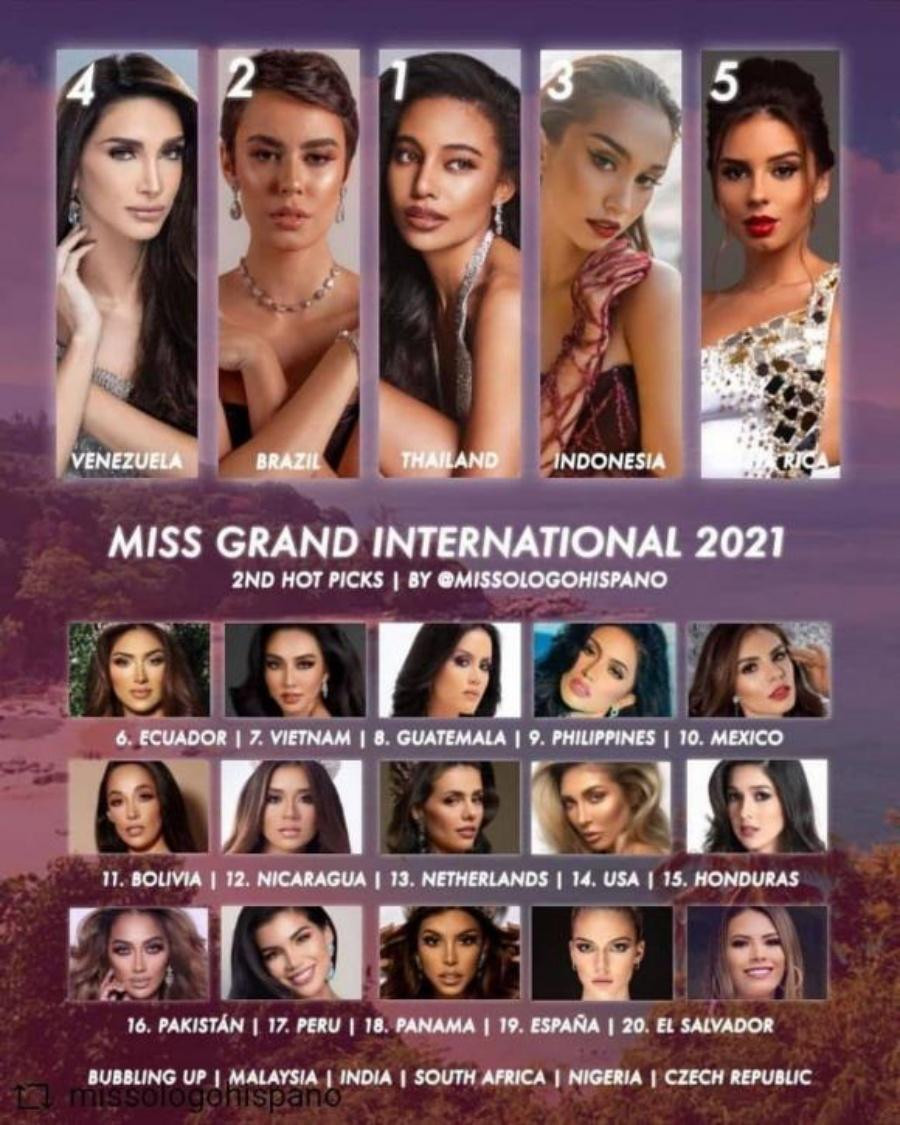 Mới đây một chuyên trang sắc đẹp đã đưa BXH dự đoán Top 20 chung cuộc của Miss Grand International năm nay, dựa trên số lượng gần 40 người đẹp đến từ 40 quốc gia và vùng lãnh thổ trên thế giới đã chính thức ghi danh. Theo đó, người đẹp Nguyễn Thúc Thùy Tiên đại diện cho Việt Nam được dự đoán sẽ giành vị trí thứ 7 chung cuộc.