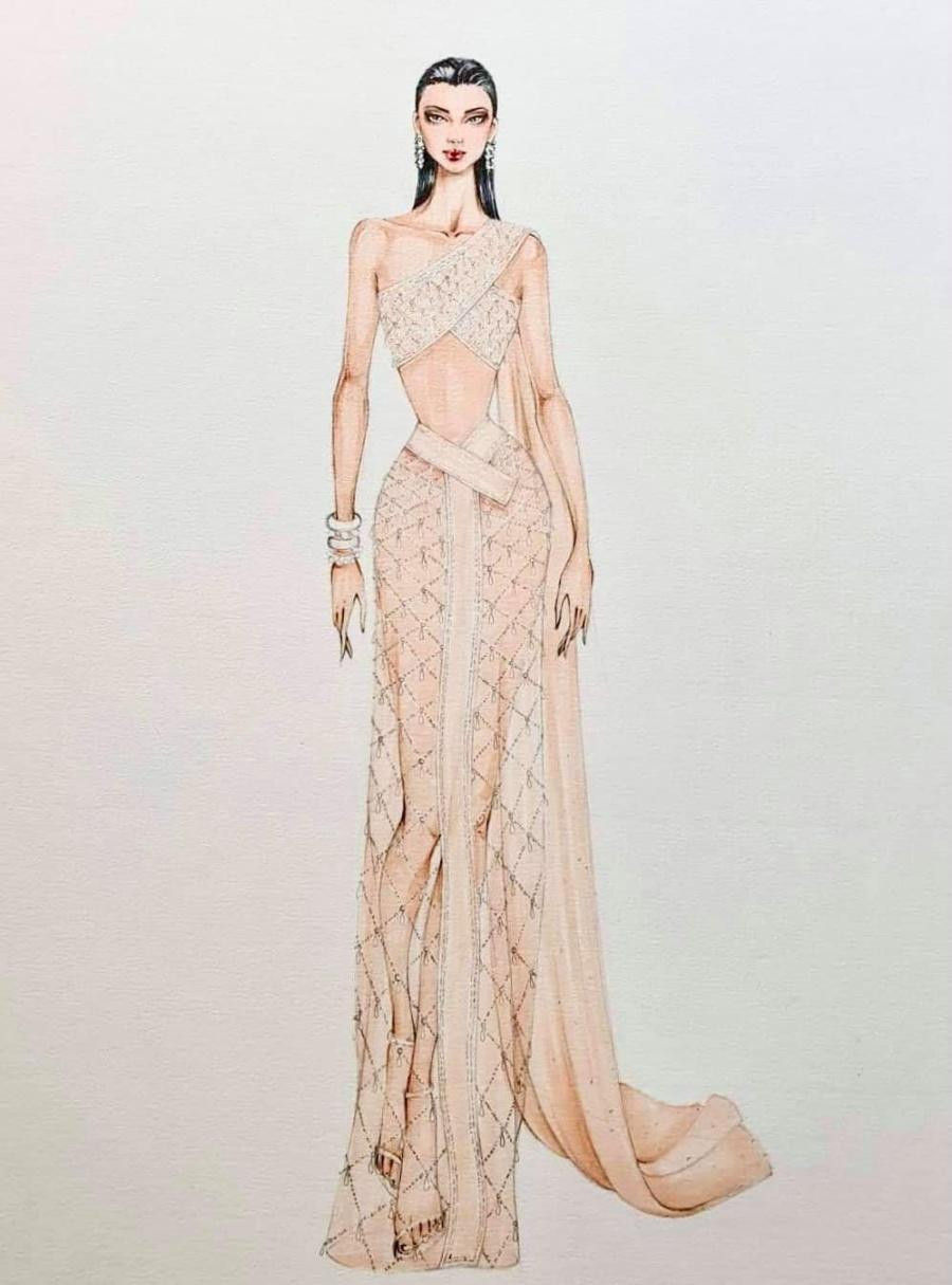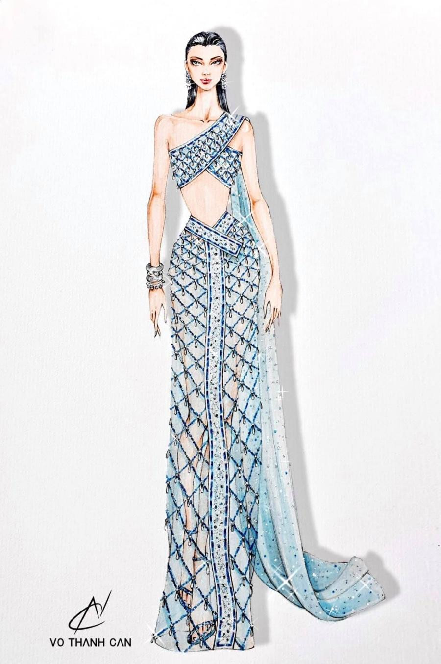Thiết kế đạng xuyên thấu, khi hoàn thành sẽ mang gam màu xanh, nhìn xa đẹp như một bộ váy của nàng tiên cá, được cho là sẽ rất hợp với vóc dáng của người đẹp Thuỳ Tiên.