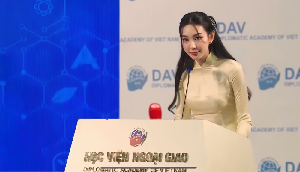 HHTO - Ngày 22/4, Hoa hậu Nguyễn Thúc Thùy Tiên có mặt tại Học viện Ngoại giao để tham dự chương trình đối thoại giữa Tổng Thư ký ASEAN với thanh niên ASEAN.