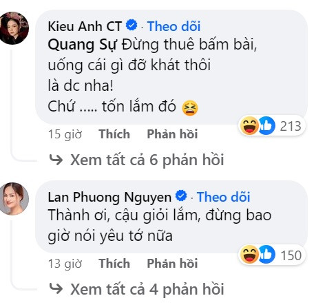 Dưới bức ảnh này, các diễn viên khác ở Gia Đình Mình Vui Bất Thình Lình đã nhanh chóng “ôn lại kỷ niệm xưa”. Lan Phương "dằn mặt" Doãn Quốc Đam rằng “Đừng bao giờ nói yêu tớ nữa” trong khi Kiều Anh dặn Quang Sự là (hát karaoke) đừng thuê bấm bài.