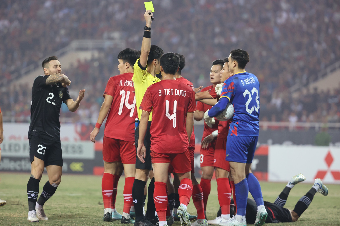 Phút 24, Tiến Dũng phải nhận thẻ vàng sau tình huống trước vòng cấm đội tuyển Việt Nam. Cầu thủ bên phía Indonesia ôm mặt đau đớn, ra dấu bị Tiến Dũng cùi chỏ. Ban huấn luyện đội khách phản ứng dữ dội, đòi trọng tài phải nặng tay hơn.