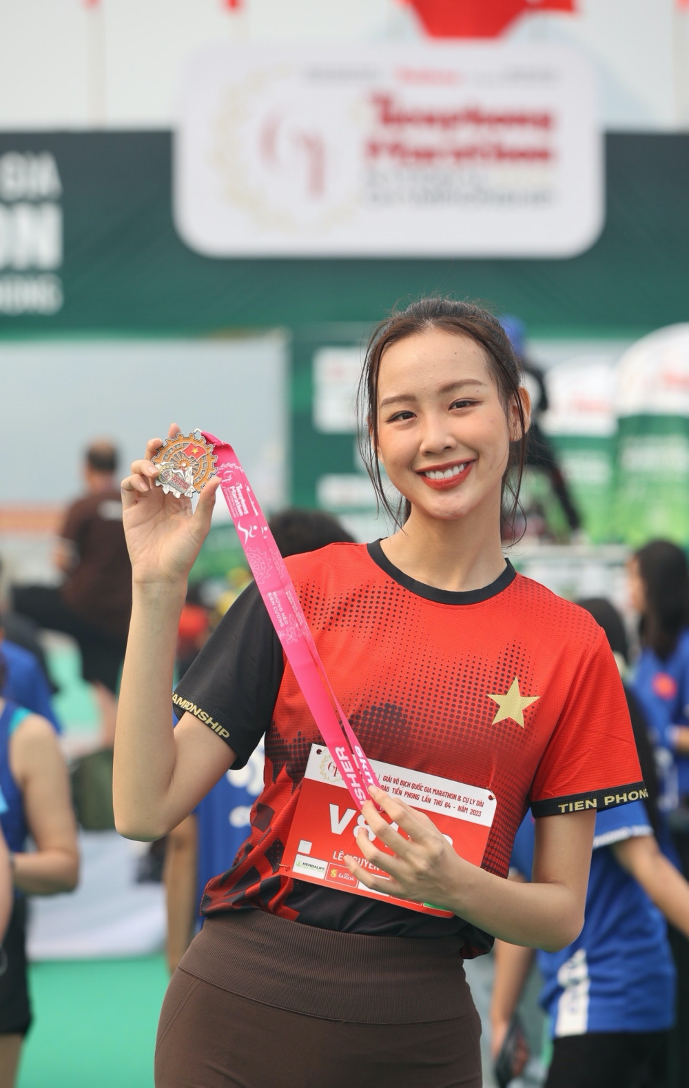 Các người đẹp hào hứng với tấm huy chương kỷ niệm sau khi tham gia chạy đồng hành cùng Tiền Phong Marathon 2023.