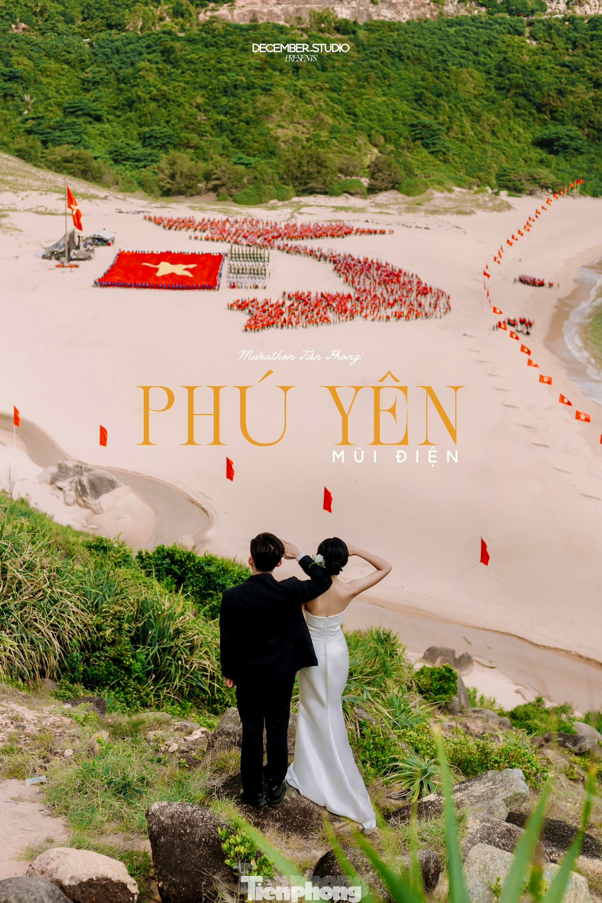 Từ Mũi Điện có thể ngắm toàn cảnh Bãi Môn, nơi diễn ra Lễ Thượng cờ. Đôi bạn trẻ - chàng trai Quốc Anh quê Đồng Tháp và vợ sắp cưới Quỳnh Anh đến từ Gia Lai, rất biết cách nắm bắt khoảnh khắc đặc biệt, khi lá đại kỳ được trải ra ở Bãi Môn, bên cạnh dáng hình Tổ quốc được tạo nên bởi 3.200 bạn trẻ Phú Yên. Trước khi Lễ Thượng cờ chính thức diễn ra sáng 30/3, trong quá trình chuẩn bị, cả hai đã có mặt ở Mũi Điện từ rất sớm để chờ đợi, sau đó tạo nên bộ ảnh cưới tuyệt đẹp.