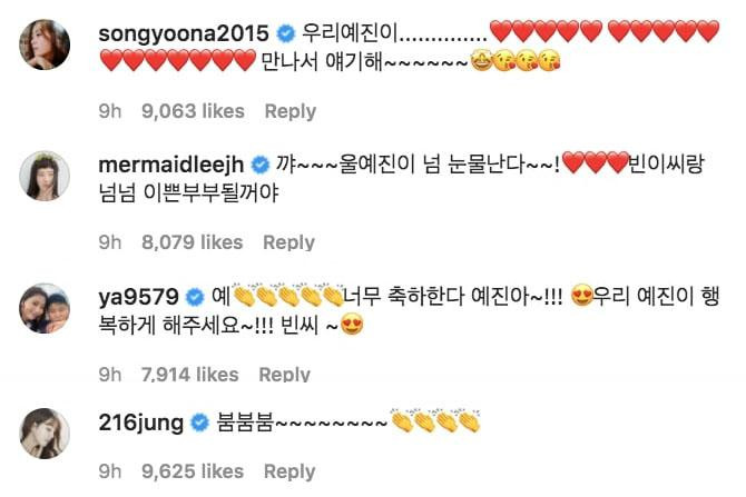 Sau khi Son Ye Jin đăng thông báo kết hôn, Song Yoon Ah, Oh Yoon Ah, Lee Jung Hyun và Lee Min Jung đã ngay lập tức gửi những lời chúc mừng đến người bạn của mình thông qua phần bình luận dưới bài đăng của Son Ye Jin.