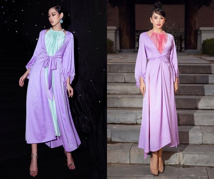 Rồi cả Đỗ Thị Hà và Tiểu Vy cùng mặc bộ váy yếm đào kèm áo choàng đậm chất dân tộc của nhà thiết kế Adrian Anh Tuấn. Hai nàng hậu chọn áo choàng màu tím nhạt, chỉ khác màu váy bên trong tạo ra phong cách khác biệt.