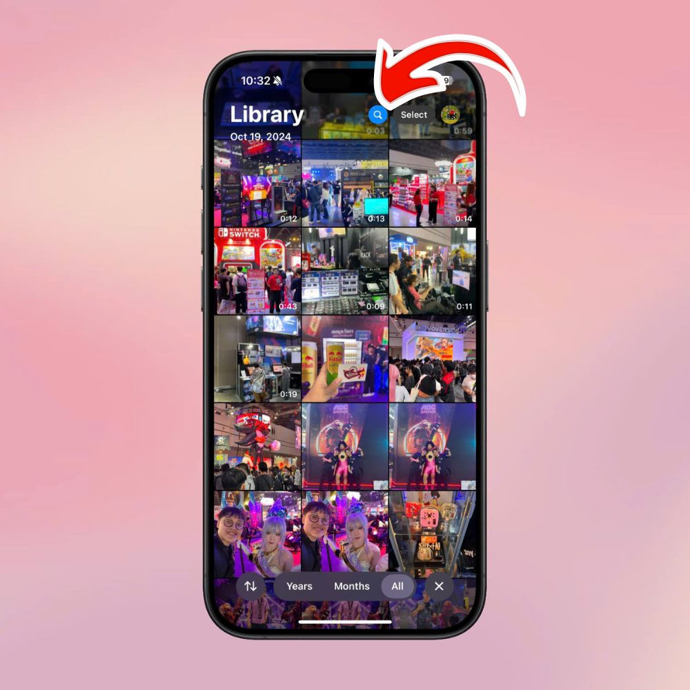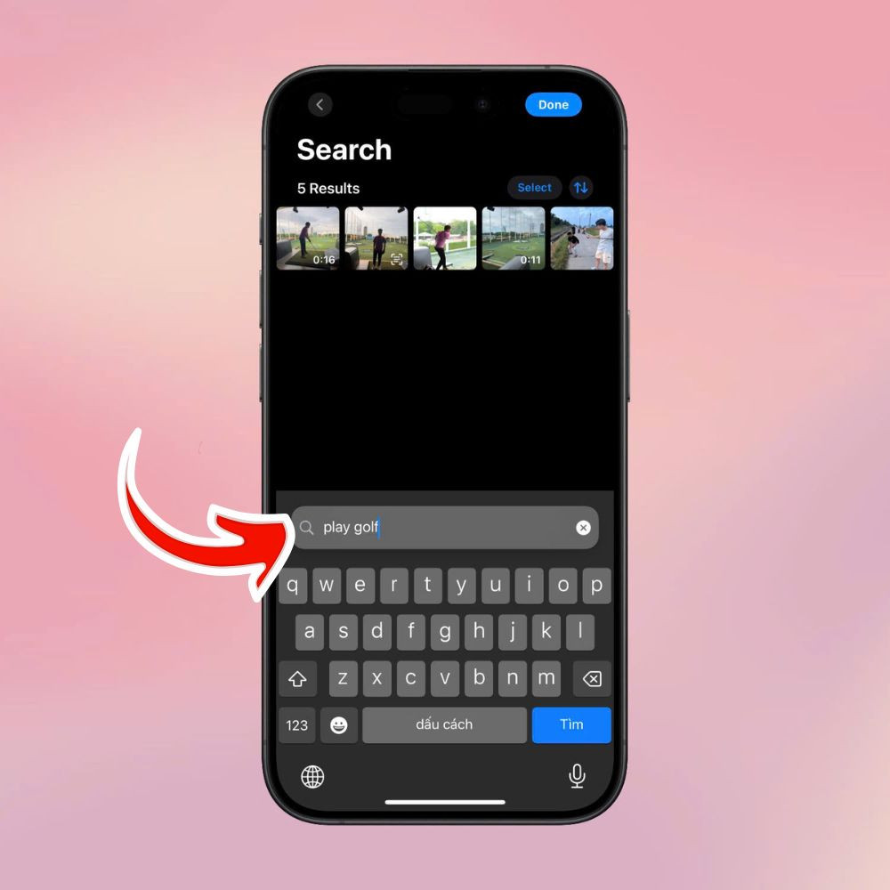 Bước 3: Để bắt đầu tìm kiếm, bạn cần nhập vào thanh tìm kiếm một từ hoặc cụm từ mô tả về bức ảnh mà bạn muốn tìm. Apple Intelligence hiểu các từ khóa như hành động (chẳng hạn “chạy”, “cười”), tên người (nếu bạn đã gắn tên trước), địa điểm cụ thể, hoặc thậm chí các danh từ như “chó”, “biển” và bạn cũng có thể kết hợp chúng để có kết quả chính xác hơn.