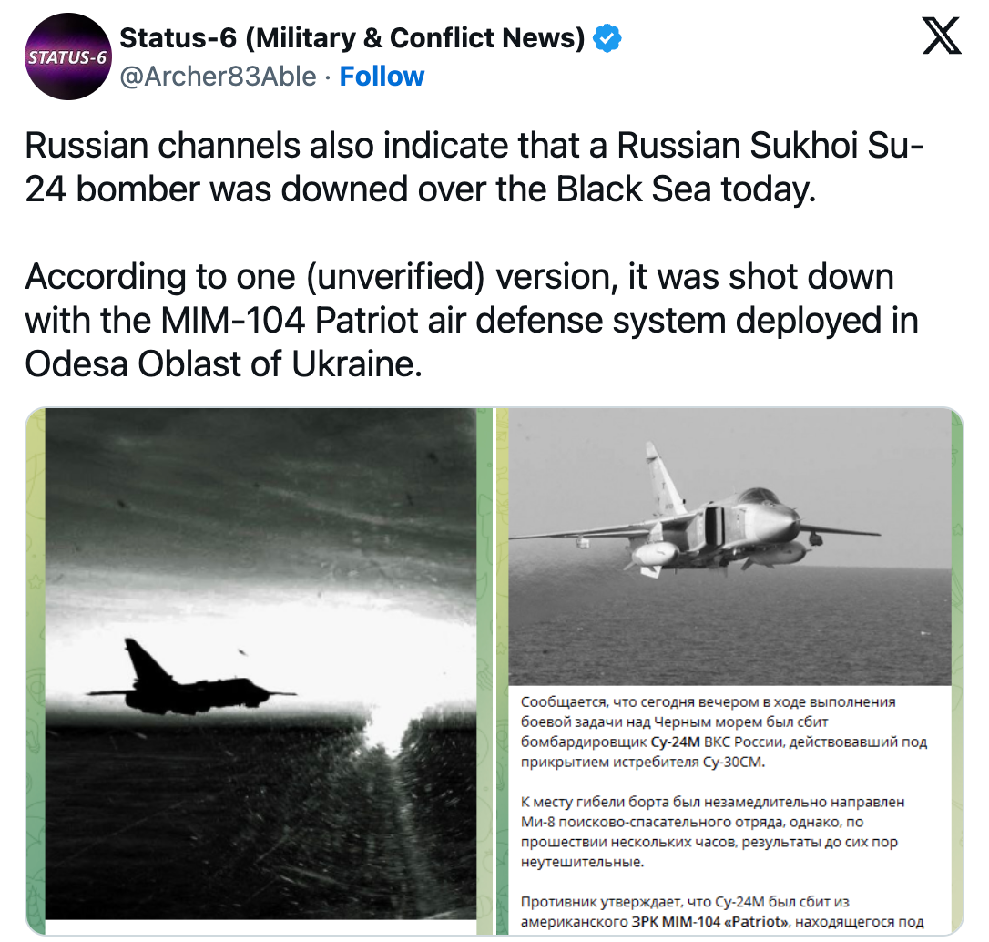 Một số kênh mạng xã hội tiếng Nga đã đăng tải thông tin Su-24M Fencer bị bắn hạ trên Biển Đen. Ảnh: X